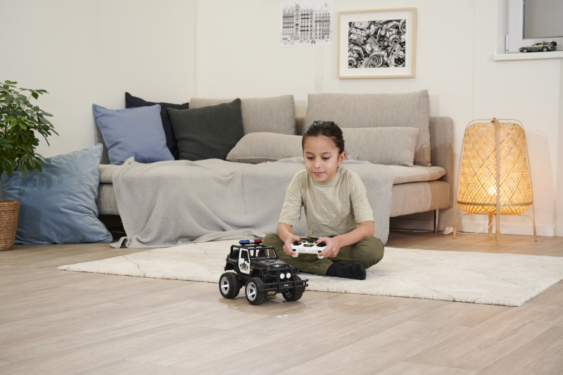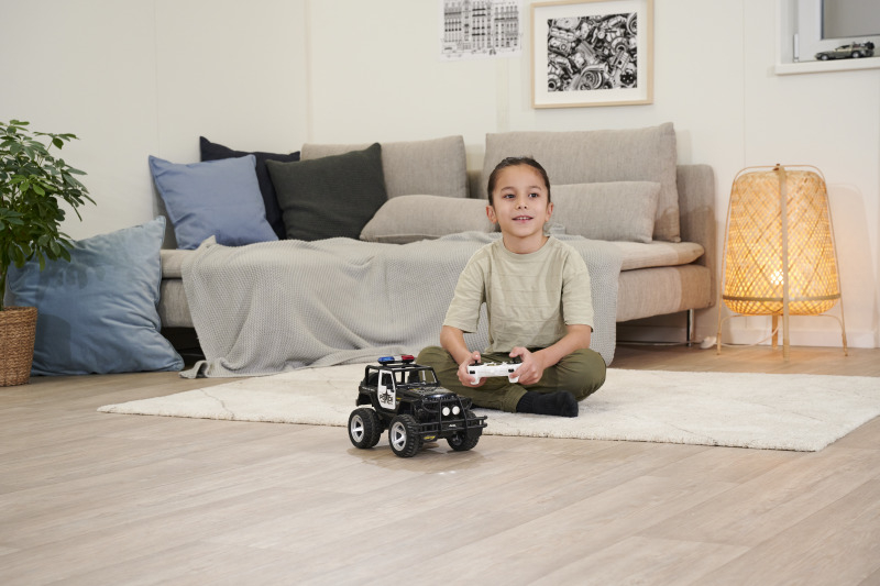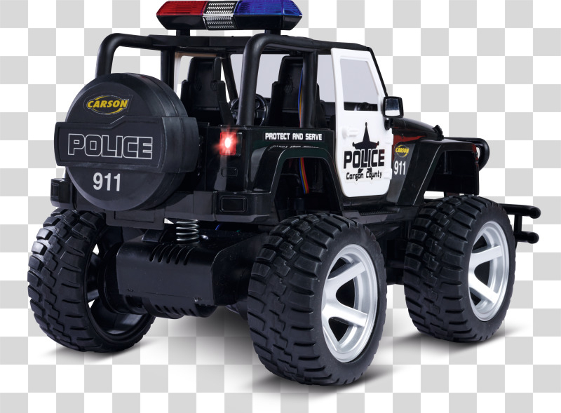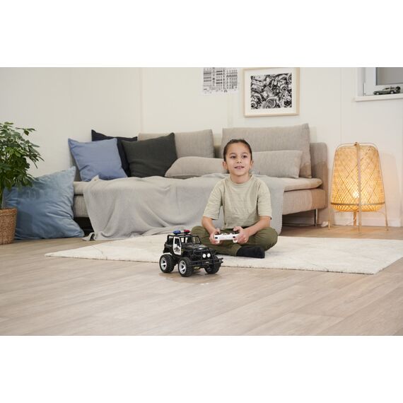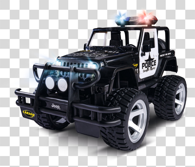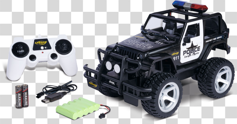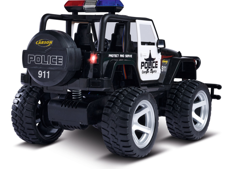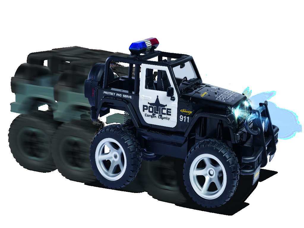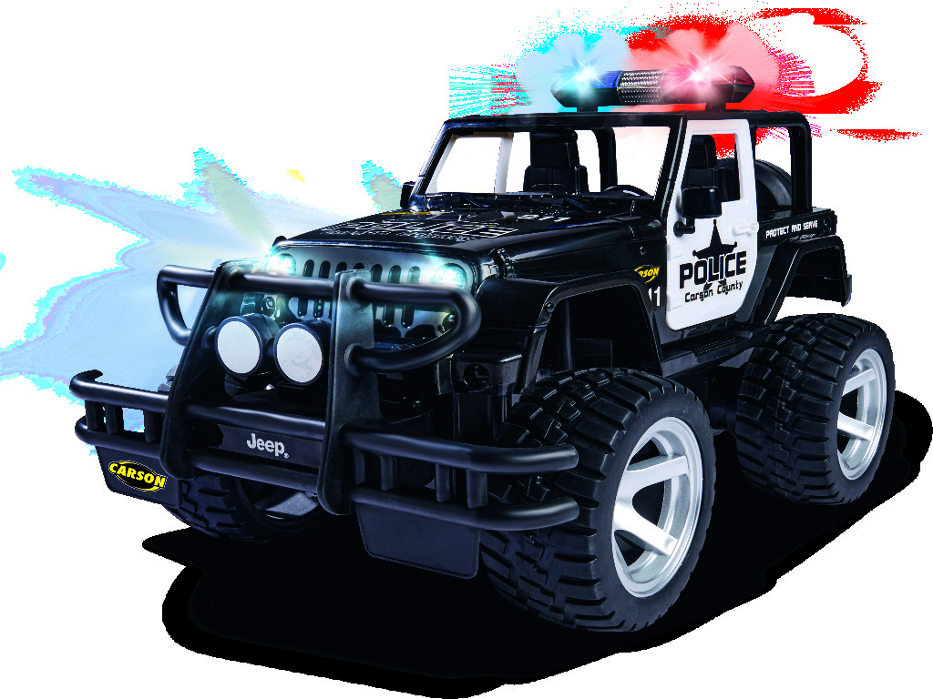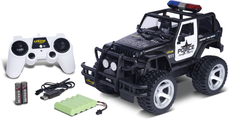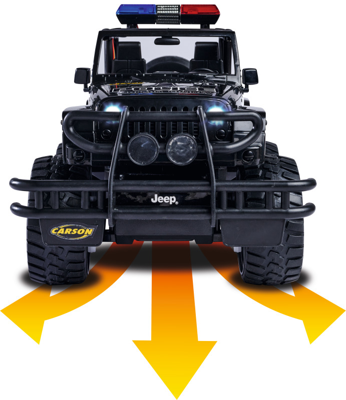 Mit dem CARSON Jeep Wrangler Police im Maßstab 1:12 hat das Verbrechen auch im Gelände keine Chance! Dafür sorgen eine gesperrte Starrachse, eine schlagfeste und robuste Karosserie sowie ein kräftiger Elektromotor, der den Jeep antreibt. Die griffig profilierten Gummireifen geben dem RC-Offroader die nötige Bodenhaftung. Der massive Frontrammer sowie Front- und Heckbeleuchtung runden den bulligen Auftritt ab. Der ferngesteuerte CARSON Jeep Wrangler Police verfügt außerdem über ein Blaulicht und eine Sirene, die über den Sender geschaltet werden können. Er wird mit einem störungsfreien 2.4 GHz Fernsteuersystem, Senderbatterien, Fahrakku und Ladegerät ausgeliefert und ist direkt nach dem Laden startklar. Kaufen - Laden - Fahren!