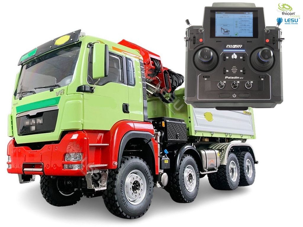 8x8 3-Seitenkipper mit Ladekran fertig aufgebaut und lackiert, Beleuchtung, Sound, Paladin PL18EV Flag, alles fahrfertig eingestellt.