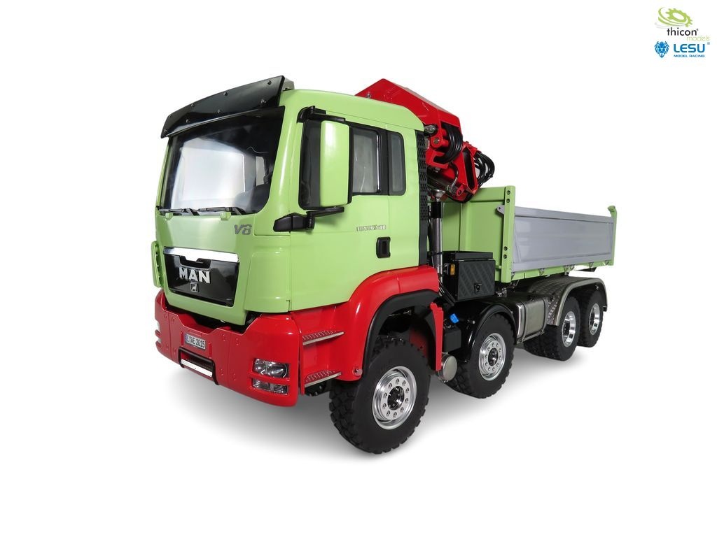 8x8 3-Seitenkipper mit Ladekran fertig aufgebaut und lackiert, Fahrerhausbausatz lackiert, Beleuchtung, Sound.