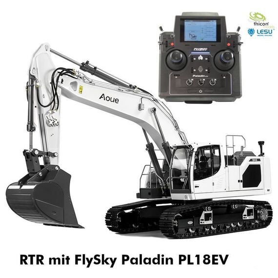 Bagger fertig aufgebaut und in weiß lackiert, fertig eingestellt und fahrbereit mit FlySky Paladin PL18EV flag, Hydraulikanlage mit Brushless-Pumpe, Ölkühler, 6-fach-Steuerventil, Motoren, Regler, Servos, Bauanleitung.