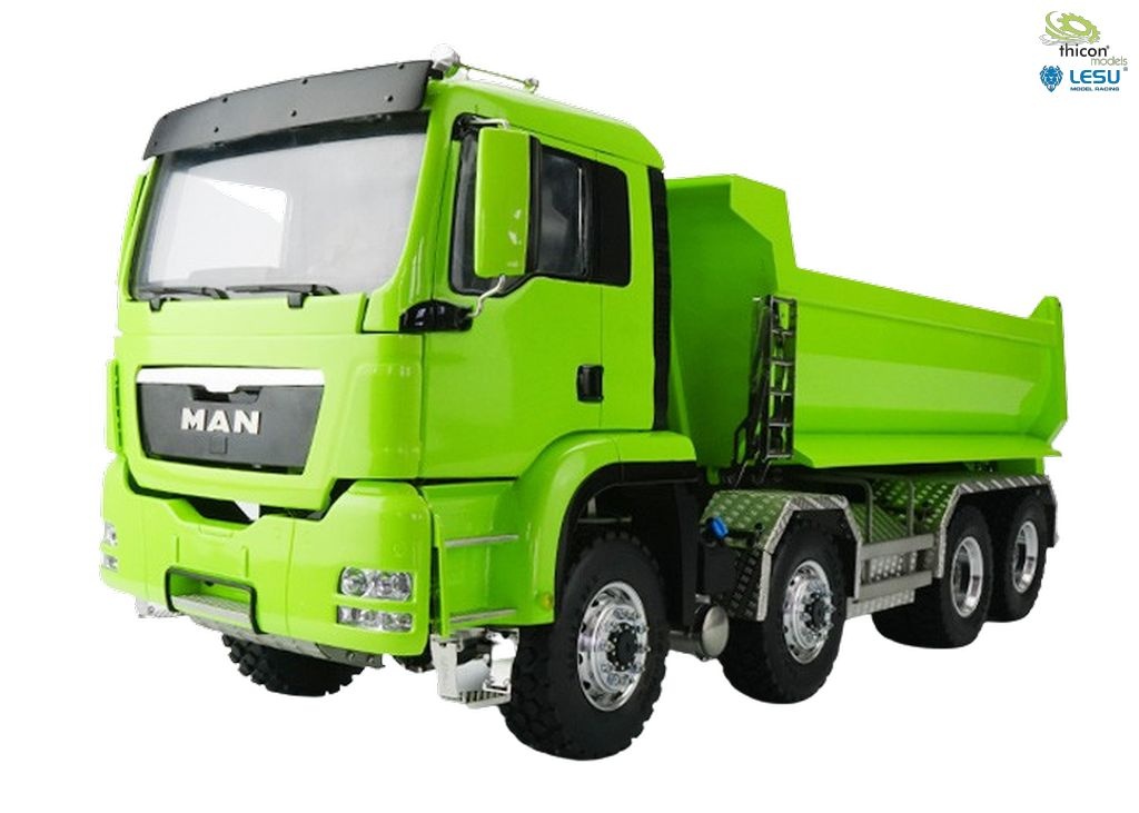Lieferumfang: Fertig montiertes 8x8-Chassis unlackiert mit Antrieb, Hydraulik, MAN TGS Fahrerhausbausatz, Servos und kleiner LED-Lichtanlage.