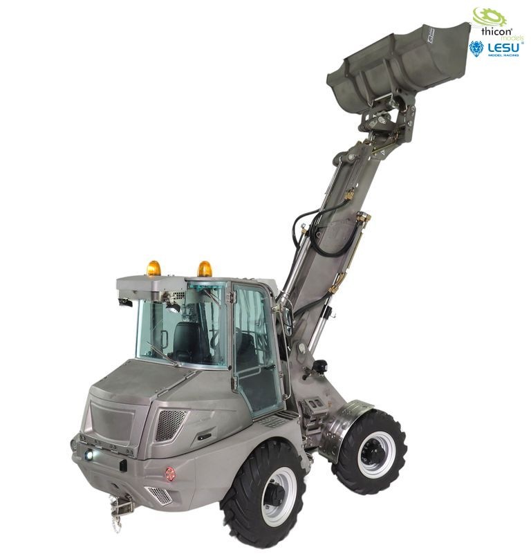 Lieferung: Bausatz unlackiert inkl. Hydraulikzylinden, Brushlesspumpe, Servos und Fahrmotor mit Regler, Licht und Sound, Gabelschaufel.