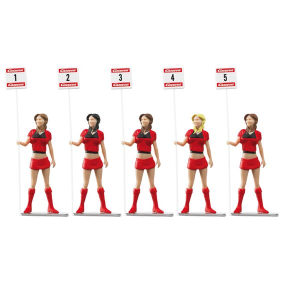 Figurensatz aus 5 stehenden Boxengirls mit Startnummern. Detailgetreu bemalt und mit beweglichen Teilen.