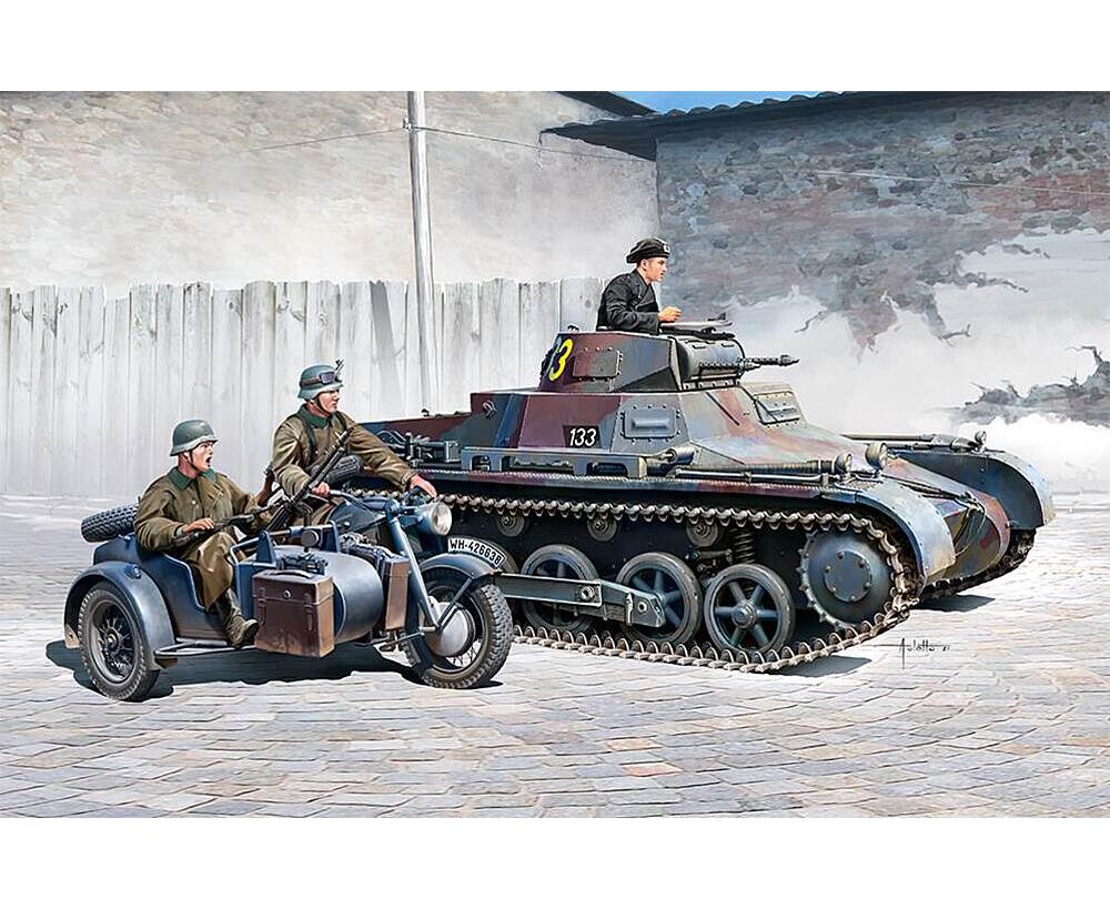 1/35 Panzer I Ausf. B & Motorrad. Plastikmodellbausatz eines deutschen WWII Panz