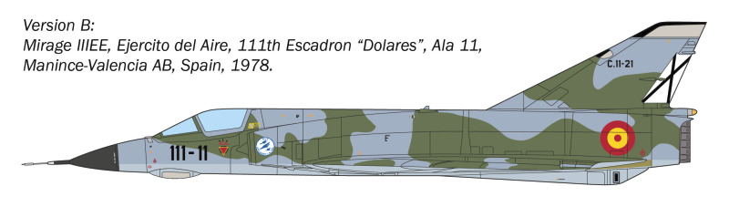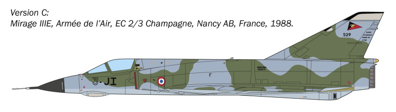 Die Dassault Mirage III ist ein Meilenstein in der französischen Luftfahrtproduktion. Hergestellt ab den frühen 1960er Jahren, um die Einheiten der Armée de l'Air auszurüsten, erwies sie sich sofort als äußerst effektiv. Sie wurde schnell zu einem kommerziellen Erfolg und wurde in zahlreiche Länder exportiert, wo sie an verschiedenen Konflikten in den 1970er und 1980er Jahren teilnahm. Gekennzeichnet durch ihren unverwechselbaren Deltaflügel, war sie dank ihres Snecma Atar-Motors mit Nachbrenner in der Lage, Mach 2 zu überschreiten. Nach der Mirage IIIC, die für die Rolle des Abfangjägers bestimmt war, wurde die Mehrzweck- und Bodenangriffsversion entwickelt. So entstand die Mirage IIIE, die aerodynamisch durch eine Verlängerung des Rumpfes gekennzeichnet ist, um verbesserte Avionik aufzunehmen.