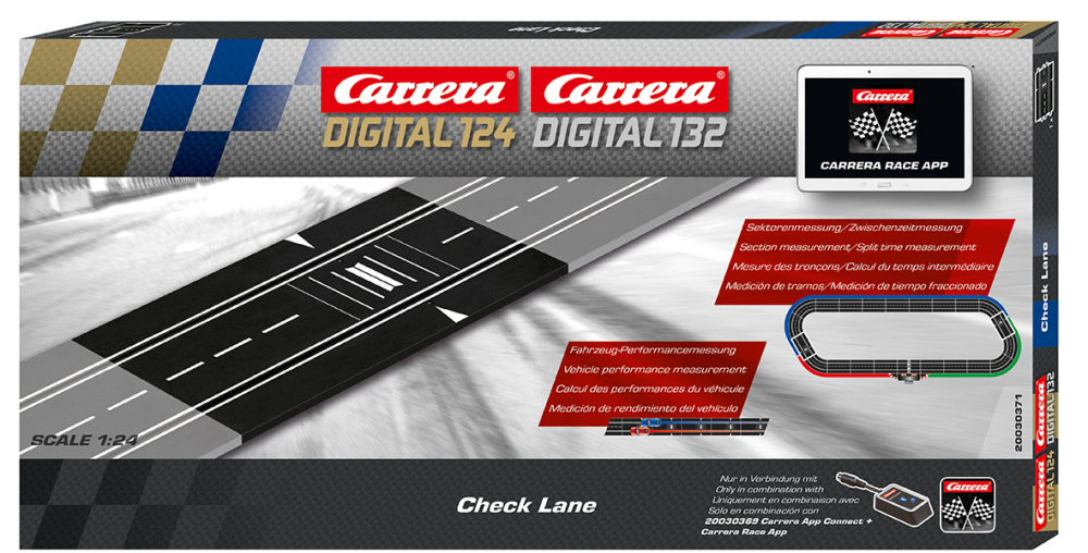 Mit der Check hast du folgende Messmöglichkeiten: Sektorenmessung /Zwischenzeitmessung oder Fahrzeug-Performancemessung. Die Zwischenzeit je Sektor (max. 3 Sektoren mit 2 Check Lanes) werden in Verbindung mit der Race App angezeigt. Einbau der Check Lanes an beliebiger Stelle. Nur in Verbindung mit Artikel Carrera AppConect (Art. 30069) und der kostenlosen Carrera Race App.