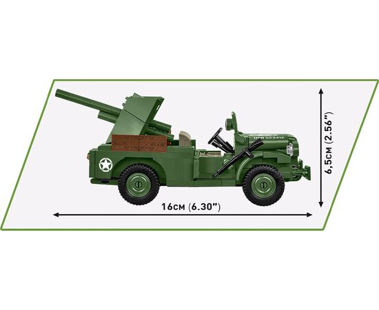 Im Jahr 1928 wurde der amerikanische Automobilhersteller Dodge vom expandierenden Konkurrenten Chrysler Corporation aufgekauft. Im selben Jahr wurde auch der Nutzfahrzeughersteller Fargo von Chrysler übernommen der sich fortan um den Export von Dogde Lastwagen unter dem Markennamen Fargo und um die Belieferung der US Army kümmerte. Die Dogde WC-Serie beinhaltete sogenannte Beeps (für Big Jeeps) leichte 4x4- und mittelschwere 6x6-Allrad-Nutzfahrzeuge für die Armee. Der 37 mm Gun Motor Carriage M6 (Populärname M6 Fargo) war ein leichter Panzerjäger mit einem Dodge-Lastwagen-Fahrgestell auf dessen Ladefläche eine M3-Panzerabwehrkanone Kaliber 37 mm montiert wurde. Der M6 Fargo konnte 80 Panzergranaten mitführen. Die Schussabgabe erfolgte vorwiegend nach hinten. Das Fahrzeug war zum Zeitpunkt seiner Einführung im Frühjahr 1942 bereits veraltet und wurde als sehr kostengünstige Übergangslösung für den damals noch in der Entwicklung befindlichen echten Panzerjäger M10 Wolverine verwendet. Modell mit 230 Teilen 1 Minifigur bedruckten Blöcken und beweglichen Elementen. Modellmasse (LxBxH): 16 x 7 x 6.5 cm