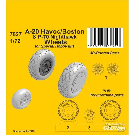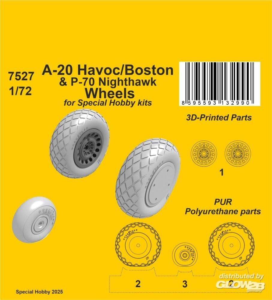 Präzise Resin-Räder mit bedruckten Felgen für die Bausätze A-20 Boston/Havoc/P-70 Nighthawk von Special Hobby.