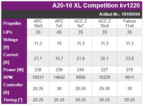 Der gewichtsoptimierte High-End-Motor A20-10 XL Competition kv1250 mit einem Gewicht von nur 104g eignet sich hervorragend für Segelflugmodelle bis 1,4kg und Motor- und Sportflugzeuge bis ca. 900g.