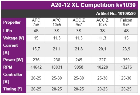 Der gewichtsoptimierte High-End-Motor A20-12 XL Competition kv1039 mit einem Gewicht von nur 104g eignet sich hervorragend für Segelflugmodelle bis 1,4kg und Motor- und Sportflugzeuge bis ca. 900g.