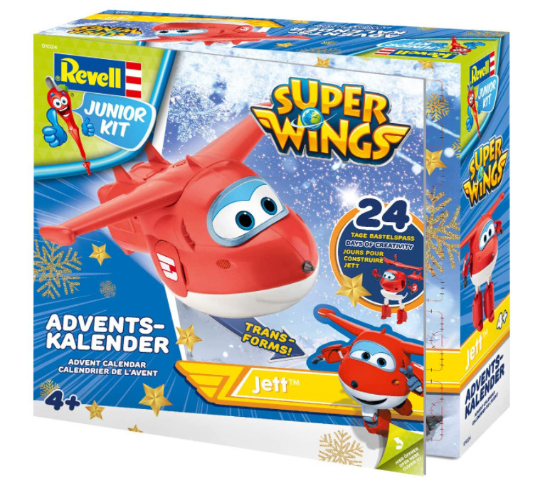 Auf in ein neues Abenteuer mit dem Super Wings Adventskalender von Revell Junior Kit. Jeden Tag bekommst du neue Bauteile, um Jett, den Helden der Serie Super Wings, mit dem Junior Kit-Schraubsystem kinderleicht zusammen zu bauen. An Heiligabend kannst du dann die Super Wings Abenteuer nachspielen. Und genau wie in der Serie, lässt sich Jett ganz einfach vom Flugzeug in einen Roboter transformieren!