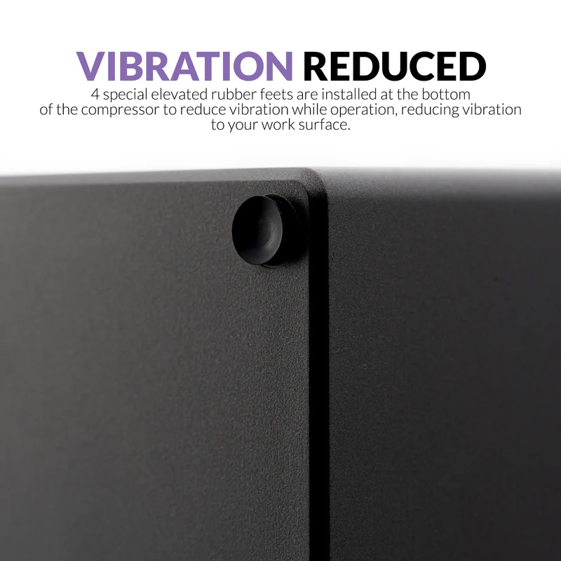 Vibrationsreduzierung: Ausgestattet mit vier speziellen, erhöhten Gummifüßen minimiert der Kompressor Vibrationen und sorgt so dafür, dass Ihr Arbeitsbereich während des Betriebs ruhig und ungestört bleibt.