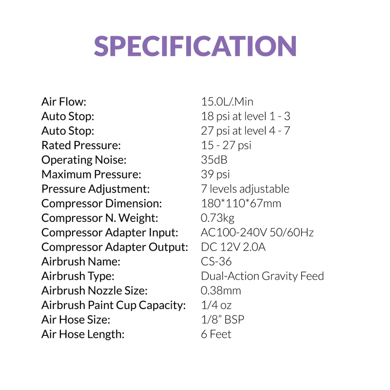 Alles, was Sie brauchen: Der Serenair Mini-Kompressor wird komplett ausgestattet mit einer Airbrush, einem Airbrush-Schlauch und zwei Airbrush-Haltern geliefert, sodass Sie sofort loslegen können, ohne dass zusätzliches Zubehör erforderlich ist.