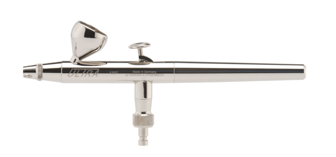Die Ultra ist mit einem 2 ml-Steckbecher und einer feinen 0,2 mm-Düse ausgerüstet. Optional kann das Gerät mit einer 0,4 mm-Düse und einem größeren 5 ml-Becher erweitert werden. Die Ultra X wird mit einer 0,4 mm-Düse ausgeliefert und ermöglicht, Farbflaschen direkt an den Sauganschluss aufzustecken.