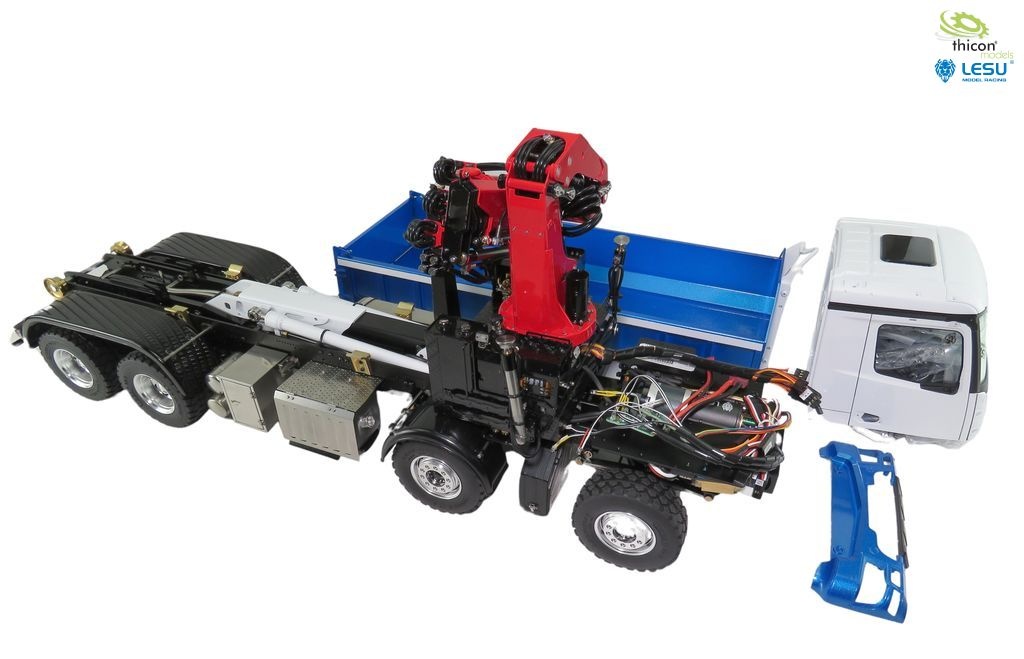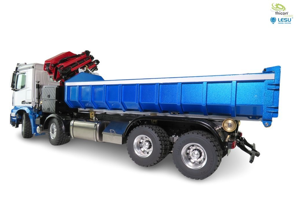 Der Ladekran ist rot/schwarz lackiert und die Mulde ist blau und das Arocs Fahrerhaus in blau/weiß.