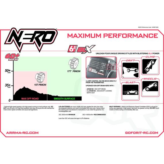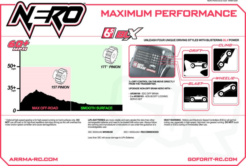 Spektakuläre Hochgeschwindigkeits-Jagden, hohe Backflips aus dem Stand, kontrollierte Sprünge über fast jedes Hindernis oder hochpräzises klettern in steilen Passagen. Ausgestattet mit permanenten Allradantrieb und den drei, am Sender zuschaltbaren, elektronischen Sperrdifferentialen hat der NERO 6S EDC immer das nötige Plus an Traktion um seine gigantische Brushless-Motor Power in Vortrieb umzuwandeln.