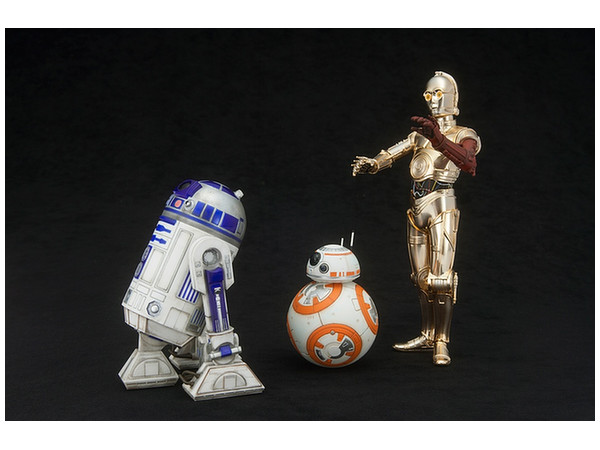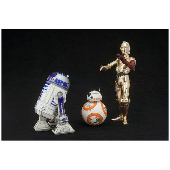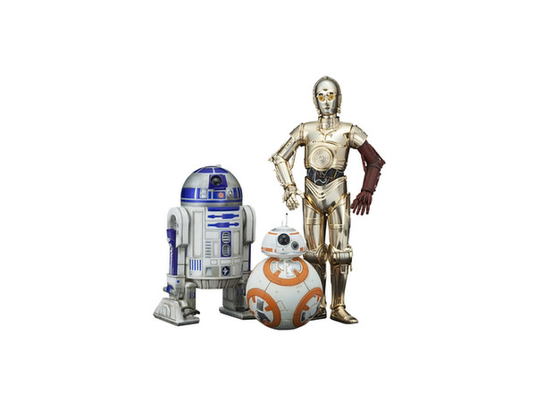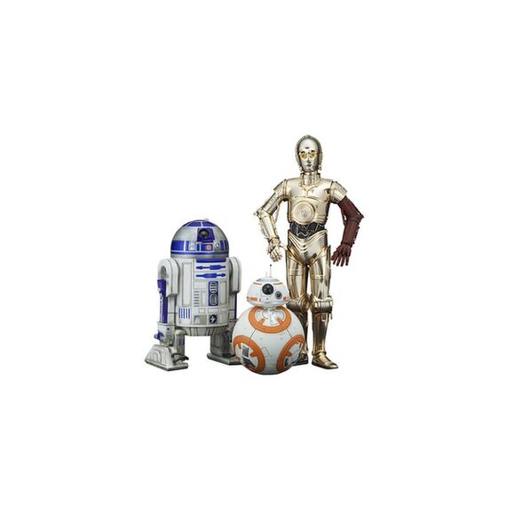 ARTFX+ Statues are fun-to-assemble pre-painted snap-fit kits that can be put together easily in seconds without glue or modeling skill. C-3PO, R-2-D2, and BB-8 are perfectly scaled (1/10) to the figures in the ARTFX+ line, and they all come with magnets in their feet or lower extremities for extra stability on the included metal display base. Display this trio of heroic droids alongside other Star Wars Episode VII: The Force Awakens figure kits from Kotobukiya!