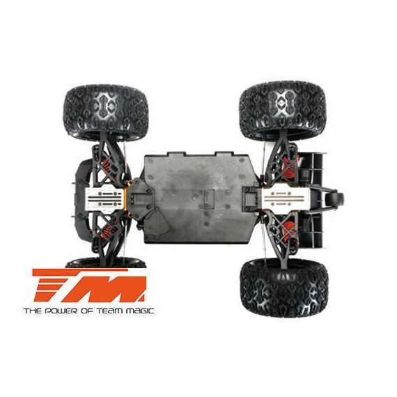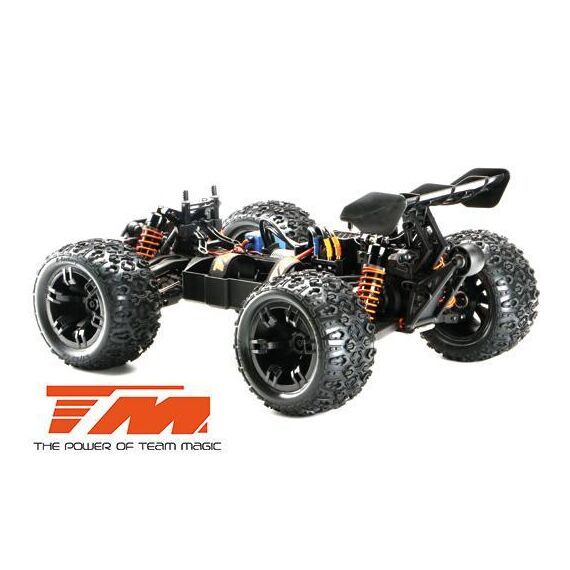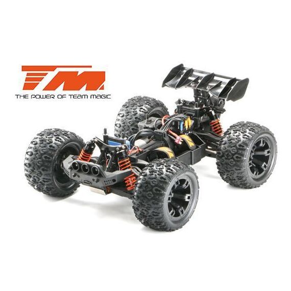 Der E5 HX ist der derzeit schnellste und stärkste 1:10 Racing Monster auf dem Markt. Der vordere Rammer ist mit drei weissen und zwei roten hellen LED's ausgestattet. Der Team Magic E5 HX beinhaltet eine schön geformte Racing Monster Karrosserie aus widerstandsfähigem Polycarbonate-Lexan um die innenliegenden Komponenten zu schützen. Robuste 14mm Radadapter helfen die hohe Kraftübertragung auf die griffigen K-Factory Reifen zu gewährleisten. Dies sorgt für bessere Fahreigenschaften und schnellere Beschleunigung auf allen Untergründen. Desweiteren ist ein einstellbares, robustes Wheelie-Bar (Stützrad) am hinteren Ende des Modells angebracht. Für eine bessere Kontrolle der Wheelies (Wheelie = auf zwei Rädern fahren), verfügt der Team Magic E5 HX über ein kugelgelagertes Wheelie-Rad. Sie werden es lieben!
