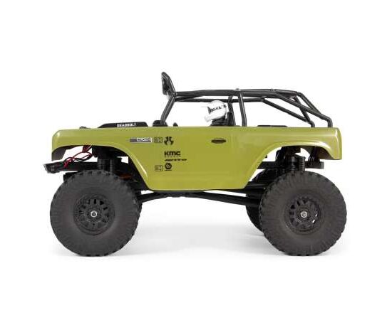Powered by an included 180-size motor and LiPo battery, the SCX24 Deadbolt shows off competence and charisma on the trails. Check out that Deadbolt body — with its narrow stance, bulging hood, realistic driver figure, and molded roll cage with realistic light bar. The realism continues right down to the ground, where you'll find licensed KMC XD229 Machete Crawl wheels wrapped in Nitto Trail Grappler tires.