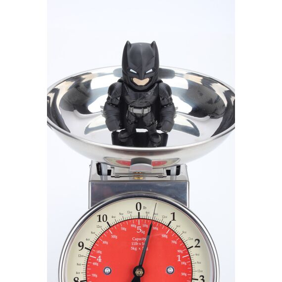 Wie im Film "Batman v Superman: Dawn of Justice" trägt die 10 cm große Batman Figur eine schwarze, stark gepanzerte Rüstung, einen Gürtel für Gadgets und Werkzeuge sowie eine Gesichtsmaske, die fast das ganze Gesicht verdeckt und nur Mund, Kinn und zwei Augenschlitze frei lässt. Detailliert und eindrucksvoll spiegelt die offiziell lizenzierte Nachbildung des DC Superhelden die düstere Ästhetik von Batmans Erscheinungsbild im Film wider.