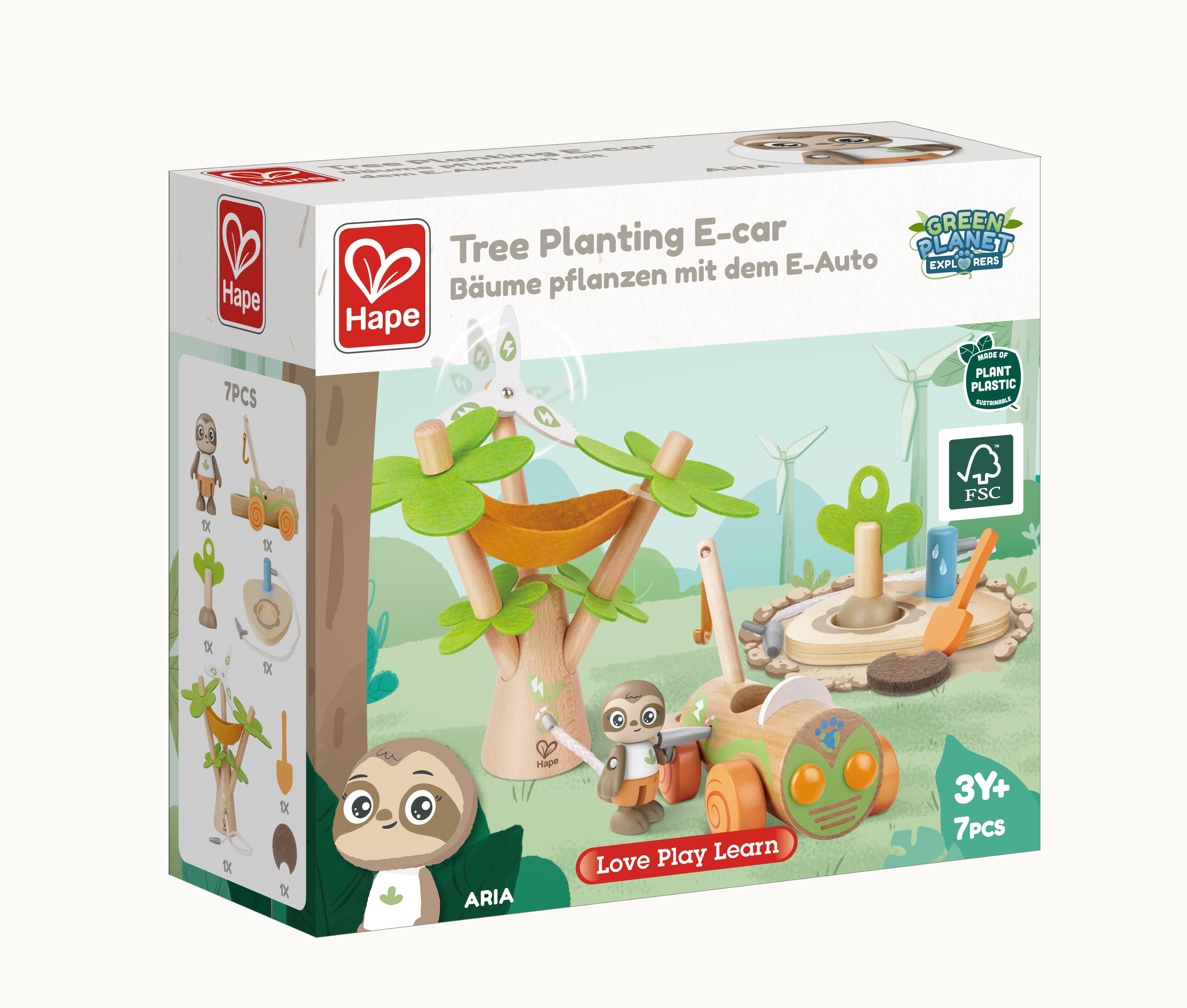 Enthält einen Baum mit Hängematte und rotierendem Windrad, ein "elektrisches" Auto mit sich drehenden Rädern, das Bäume pflanzen kann, einen kleinen Baum zum Pflanzen, einen Pflanzbereich, eine Schaufel und eine Faultierkind-Figur.