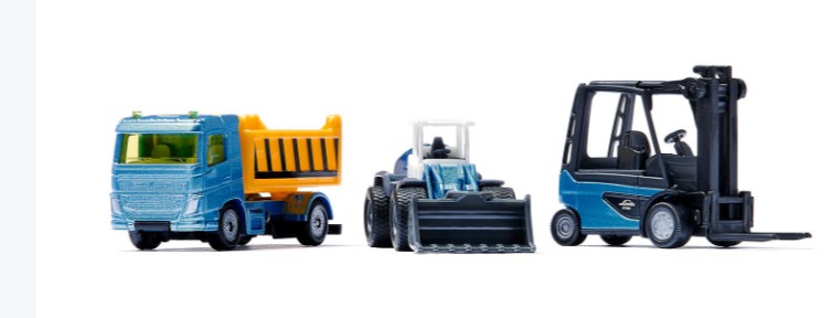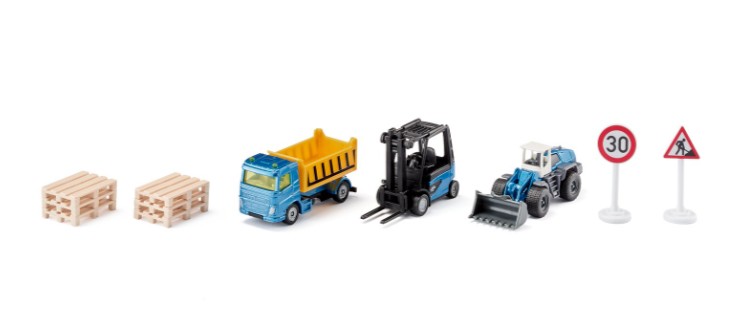 Für ein noch realistischeres Spielerlebnis sorgt das siku Geschenkset Baustelle mit drei der wichtigsten Fahrzeuge auf der Baustelle: Der schwere LKW mit der großen Mulde für den An- und Abtransport von Baumaterial und Zubehör der Gabelstapler mit seinen starken Zinkenarmen, der selbst schwerste Lasten scheinbar mühelos in die Höhe hebt und bewegt und schließlich der Radlader, eine kräftige Baumaschine mit großer Schaufel, mit der er Bauschutt, Sand und Gestein im Nu auflädt und transportiert. In leuchtend blauer Kingfisher Blue Metallic-Lackierung zeigen die drei Baufahrzeuge: Wir sind ein Team und gemeinsam schaffen wir alles - packen wir's an!