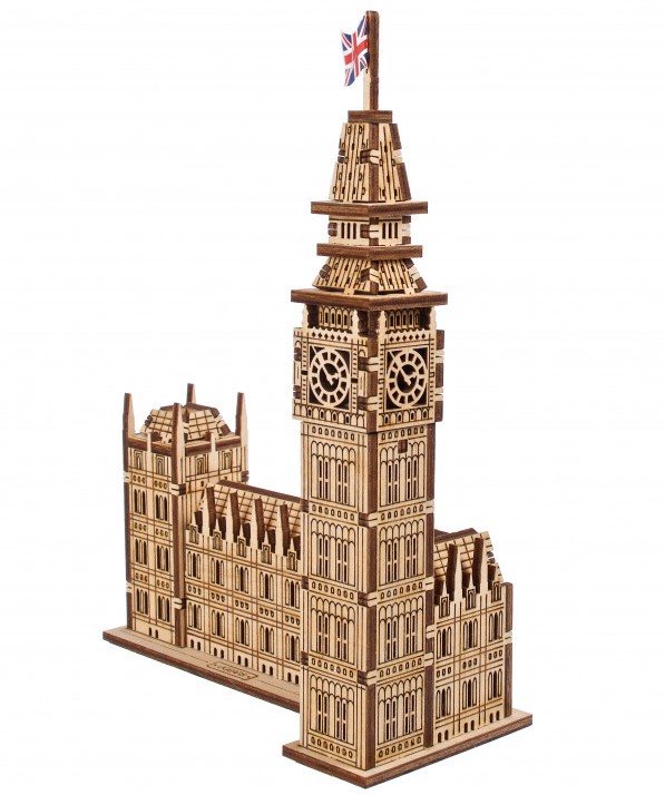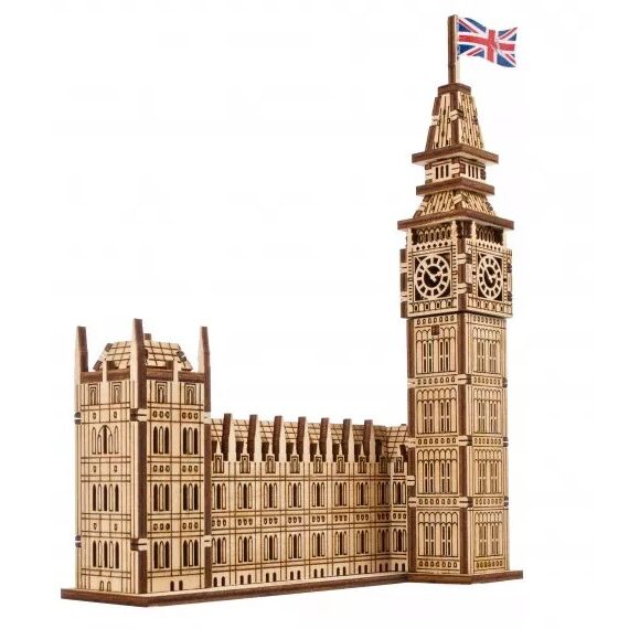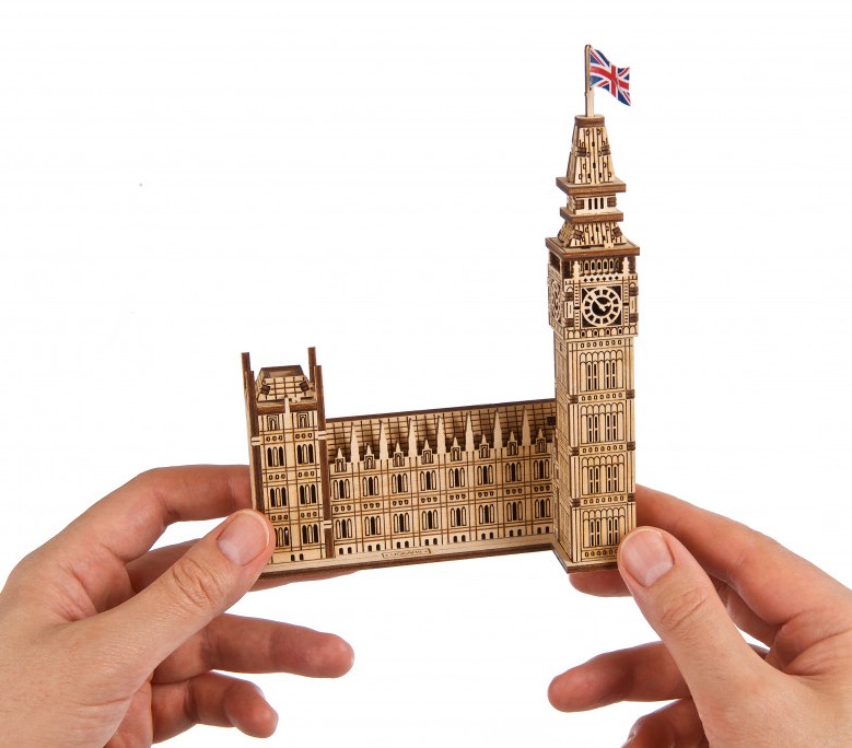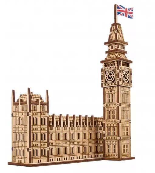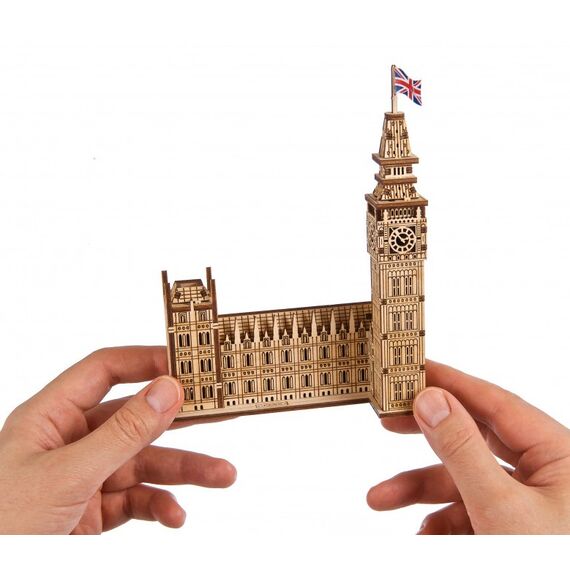 Das Modell Big Ben mit einem Teil des Sitzes des Parlaments aus der Kollektion Weltstädte von Ugears ist ein DIY Holzmodell dieses ikonischen Glockenturms im Maßstab 1:530 und mit den Abmessungen 137 x 181 x 66 mm. Mit seinen 63 Teilen aus qualitativ hochwertigem Sperrholz handelt es sich um ein Modell der Schwierigkeitsstufe „Einfach“, das in ca. 1 Stunde zusammengebaut werden kann. Dazu benötigen Sie weder Klebstoff noch spezielle Werkzeuge. Drücken Sie die Teile einfach aus den Platten, in die sie mit Laser vorgeschnitten sind, und setzen Sie sie dann zusammen. Eine illustrierte Anleitung in 11 Sprachen (Englisch, Deutsch, Ukrainisch, Französisch, Polnisch, Spanisch, Portugiesisch, Japanisch, Italienisch, Chinesisch und Koreanisch) hilft Ihnen beim Zusammenbau. Das statische 3D-Puzzle ist ein perfektes Deko-Element für Ihr Zuhause oder fürs Büro.