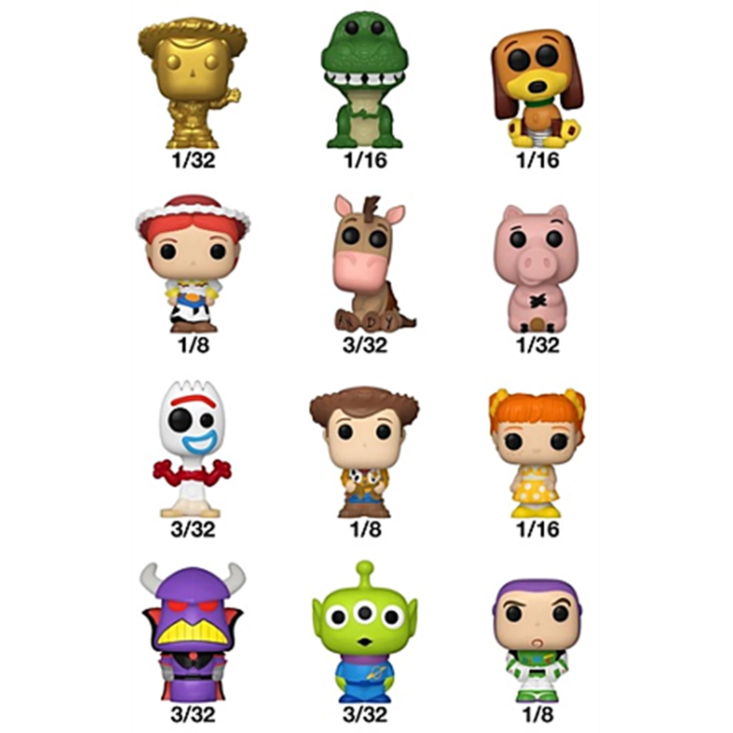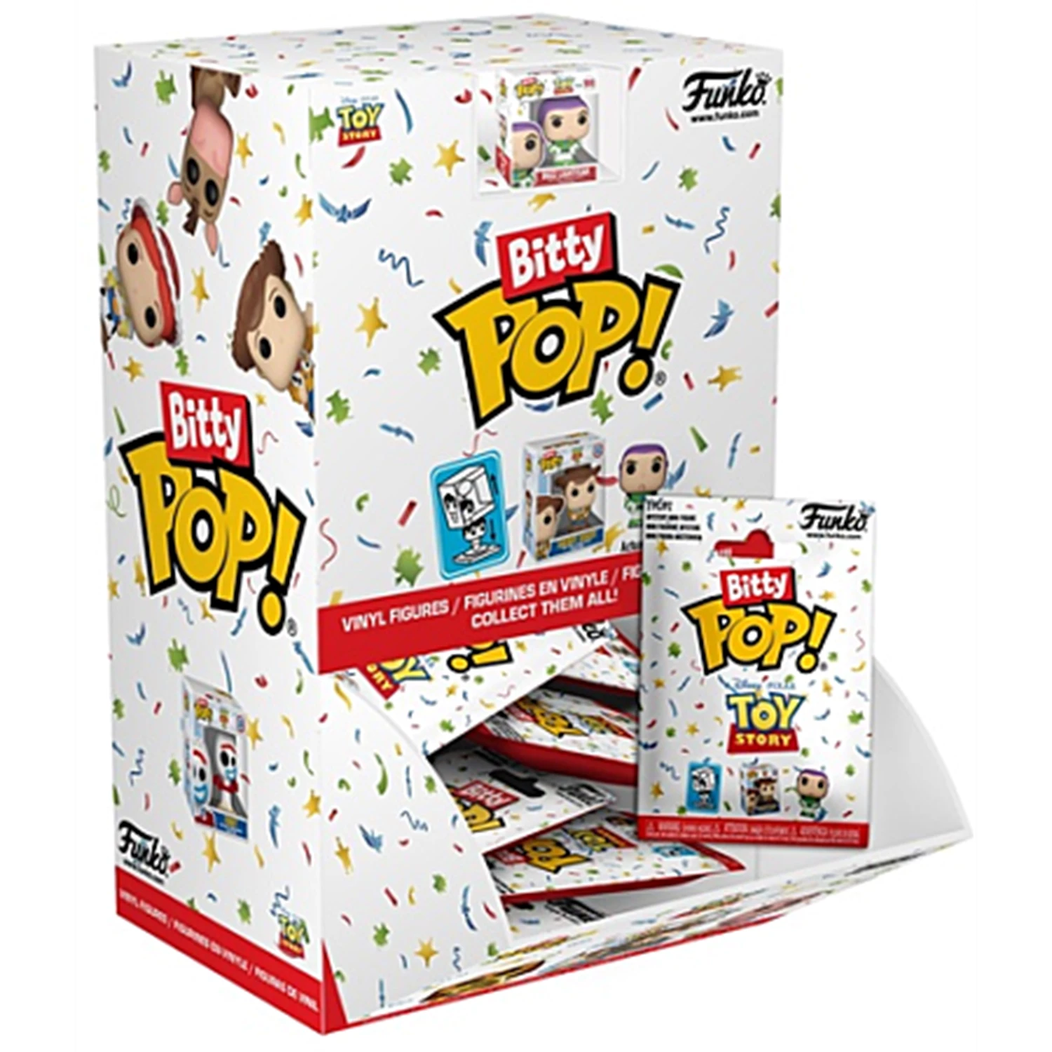 Ihre Lieblings-Pops! wurden zu Bitty POP! Sammlerstücken! Erweitern Sie Ihre Disney Pixar Toy Story-Sammlung mit diesem Sortiment an Bitty POP! Figuren, die Ihre beliebtesten sprechenden Spielzeuge darstellen! Jeder Bitty POP! wird in einer Überraschungsverpackung geliefert und enthält eine Sammlerfigur. Wen werden Sie finden? Es gibt Bitty POP! Forky (3/32), Bitty POP! Woody (1/8), Bitty POP! Gabby Gabby (1/16), Bitty POP! Jessie (1/8), Bitty POP! Bullseye (3/32), Bitty POP! Hamm (1/32), Bitty POP! Woody Gold (1/32), Bitty POP! Rex (1/16), Bitty POP! Slinky Dog (1/16), Bitty POP! Bo Peep (3/32), Bitty POP! Alien (3/32) und Bitty POP! Buzz Lightyear (1/8). Die kleinen POP! Sammlerstücke sind in stabilen Acrylhüllen mit abnehmbaren Bodendeckeln verpackt. Die abnehmbaren Bodendeckel dienen gleichzeitig als Acrylsockel, auf denen die Bitty POP! Figuren stehen. Die Vinylfiguren sind etwa 0,9 Zoll groß.