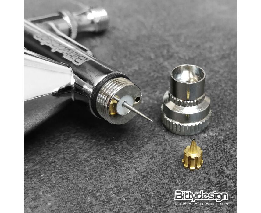 - A 0.4mm nozzle and 0.5mm needle combination for a good compromise between finer detail spraying and medium-sized spray patterns