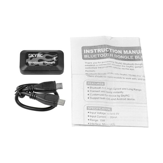 Der verbesserte SkyRC Bluetooth Dongle für Regler und Ladegeräte stellt nicht nur eine drahtlose Verbindung zwischen einem kompatiblen SkyRC Lader und dem Smartphone her, sondern auch mit passenden SkyRC Reglern. So erhält man komfortablen Zugriff auf alle Funktionen und Einstellungen der SkyCharger bzw. RC Gears App. Dank der Bluetooth-Version 5.0 bietet der Dongle genügend Reichweite und eine angenehme Übertragungsgeschwindigkeit nach modernsten Standards. Um den Dongle nutzen zu können, muss er nur mit dem beiliegenden Micro-USB-Kabel an das Ladegerät angeschlossen werden. Schon ist er sofort einsatzbereit. Ist der Dongle nicht angeschlossen, befindet er sich automatisch im Sleep-Modus.