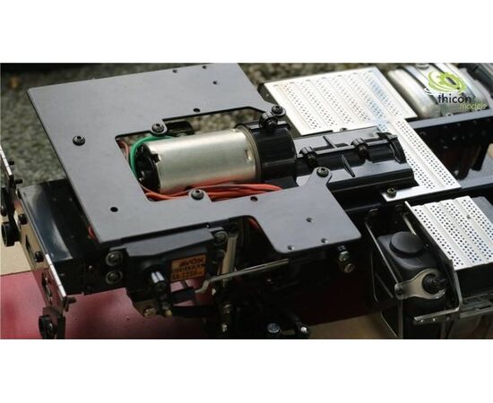 Das Bodenblech wird an den original Befestigungspunkten am Rahmen montiert. Hier kann auch das Lenkservo befestigt werden. Das 2. Blech wird in das Fahrerhaus geschraubt und stellt so die Bodenplatte mit Akkuhalterung dar. Zwischen den Grundplatten ist ein Hebelmechanismus montiert, der das Fahrerhaus vor Überkippen schützt.