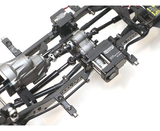 A pair of CNC aluminum winch mounts secure a standard-sized Muscle Winch servo winch on the BRX02 chassis.