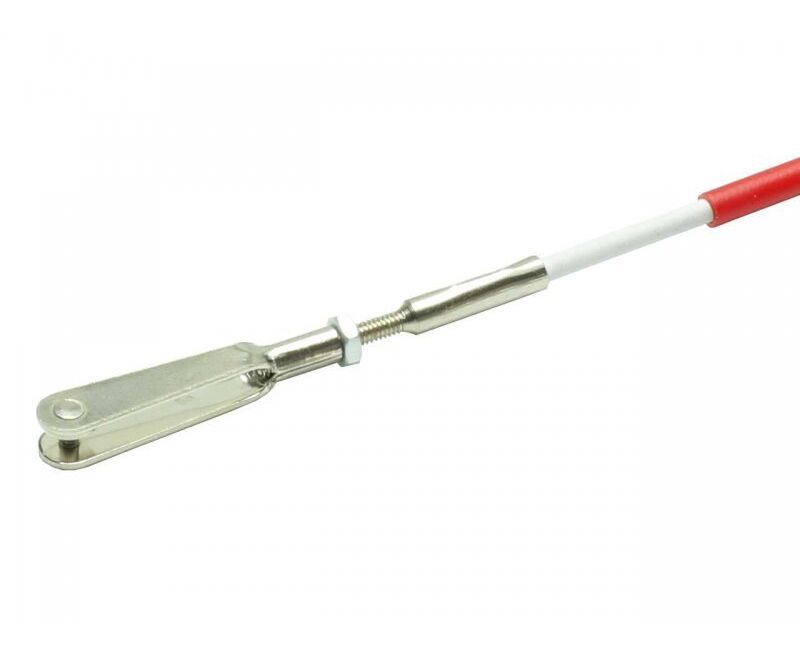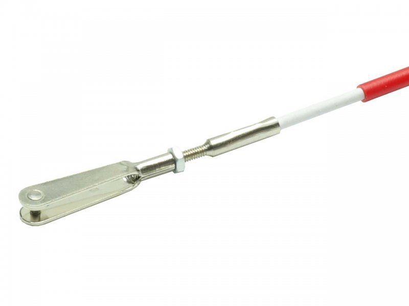 Einseitig fertig montierter Bowdenzug. Innenrohr mit durchgehendem Stahldraht verstärkt. Anschluß mit Löthülse, Kontermutter und Gabelkopf M 2. Durchmesser: Außenrohr 3 mm, Innenrohr 2 mm - Länge 1 m