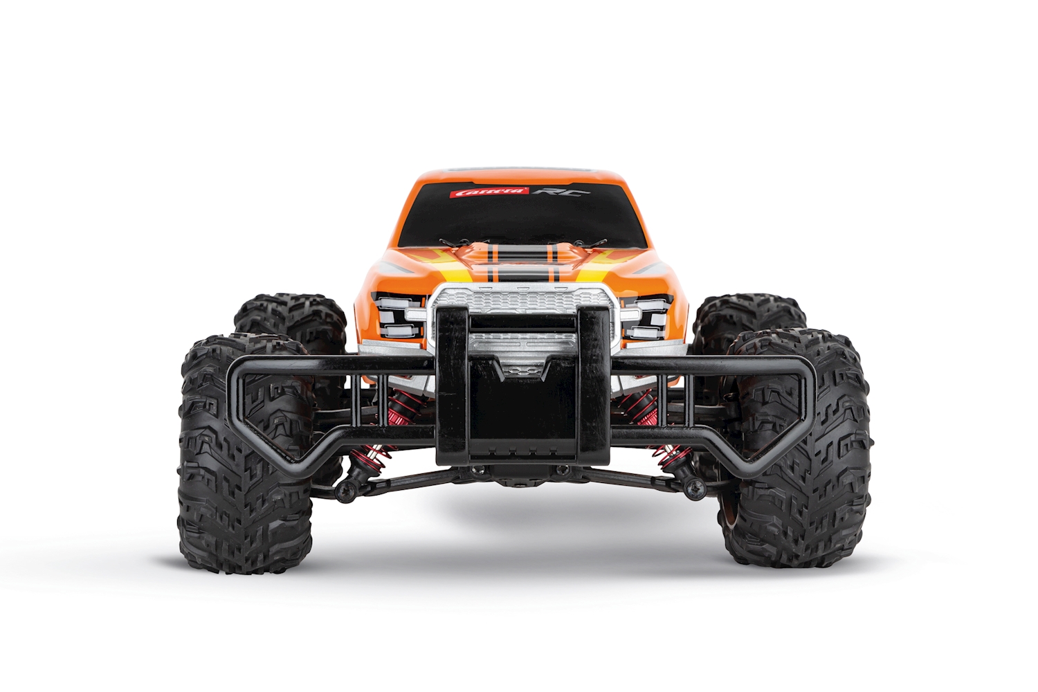 Der Kult-Pick Up Ford F-150 Raptor startet mit einem frischen Look bei CARRERA RC durch und wird auf allen Pisten zum Hingucker. Mit bis zu 30 km/h Spitzengeschwindigkeit flitzt der Raptor dank digital proportionalem Fahr- und Lenkverhalten über Stock und Stein. Er ist vollgefedert und mit Luftreifen ausgestattet, sodass ihn nichts aufhalten kann. Durch das hochwertige Metallgetriebe und den langlebigen LiFePO4-Akku haben die Fahrer lange Freude an ihrem US-Outdoor-Champion. Original lizenzierter Pick Up im Massstab 1:16 mit einer Länge von 30.4 cm, mit Digital Proportional-Steuerung, Ready-to-run mit 6.4V - 700mAh LiFePO4-Akku (600053), 1A USB-Ladekabel (600054) und 2 LR03/AAA-Batterien für die Fernbedienung. Laufzeit: 20 Minuten. Ladezeit: 90 Minuten. Geschwindigkeit: bis zu 30 km/h.
