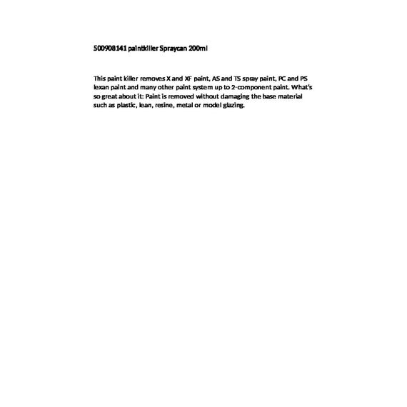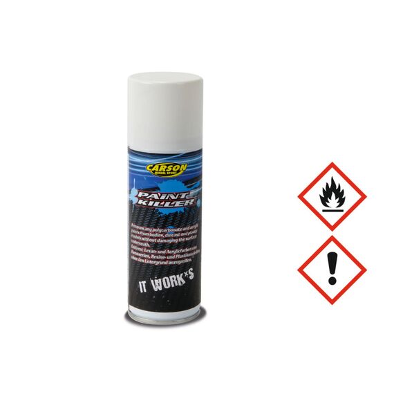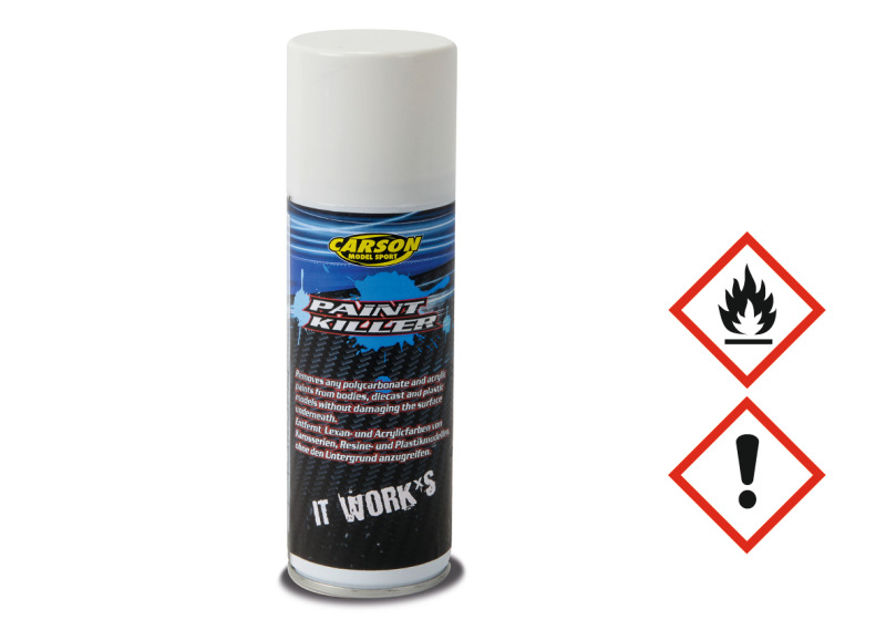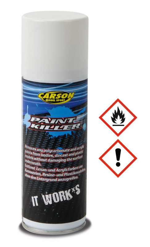 Das CARSON Paint Killer Lackentfernerspray löst alle X- und XF-Lacke, AS- und TS-Sprühfarben, PC- und PS-Lexanfarben sowie viele andere Lacksysteme bis hin zu 2-K Lacken. Der Hammer aber ist, dass diese Lacke entfernt werden, ohne das Trägermaterial wie Plastik, Lexan, Resine, Metall oder Modellverglasungen anzugreifen. Versuche haben gezeigt, dass selbst 10 Jahre alte Tamiya Color Acrylic Paint-Lackierungen mühelos von Panzern, Flugzeugen oder ähnlichen Modellen mühelos entfernen lassen. Dies bedeutet, dass ärgerliche Lackier-Missgeschicke aus der Vergangenheit problemlos retuschiert werden können. Selbstverständlich können damit auch ältere Polycarbonat-Farben entfernt werden.
