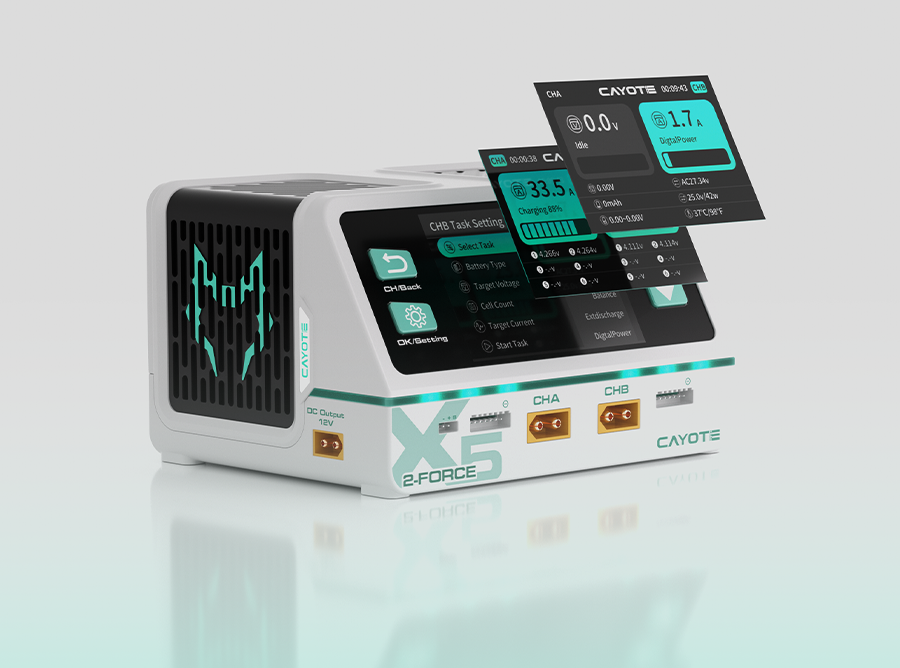 2-Force X5 is a dual-channel smart charger designed for professional RC model racing users, combining high-performance power management technology, exceptional user interaction, and a variety of operational modes.
