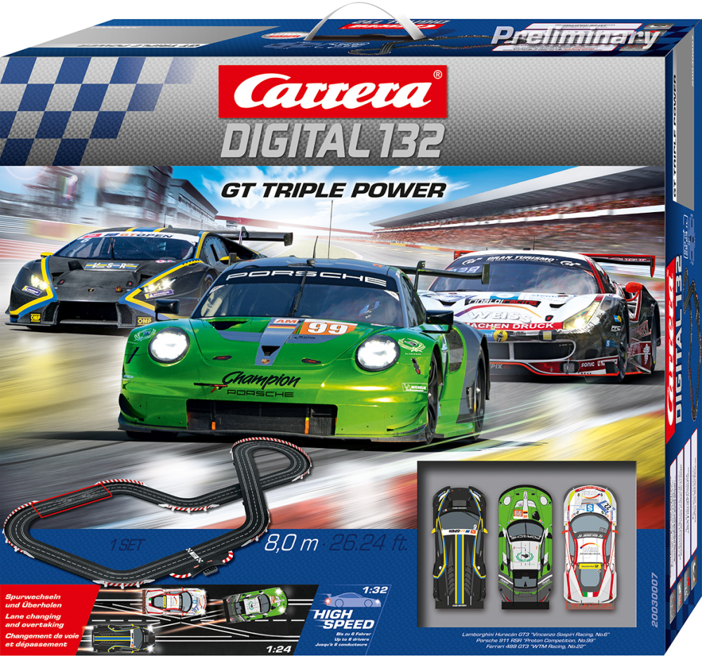 In dem Set sind die drei Slotcars Lamborghini Huracán GT3, Ferrari 488 GT3 und der Porsche 911 RSR enthalten. Unter Deiner Steuerung fahren die Supersportwagen im Maßstab 1:32 die 8 Meter lange Strecke im Maßstab 1:24 entlang. Dank der großzügigen Aufbaumaße von 321x152 holst Du Dir die GT3-Strecke direkt in Dein Wohnzimmer. Die Slotcars sind mit Front-, Rück-/Bremslicht ausgestattet und individuell codierbar. Du kannst bis zu 5 Freunde einladen, die sich mit Dir eine aufregende Jagd auf der Carrera DIGITAL 132 Strecke liefern. Eine kurvenreiche Strecke mit einer Haarnadelkurve wartet auf Euch.