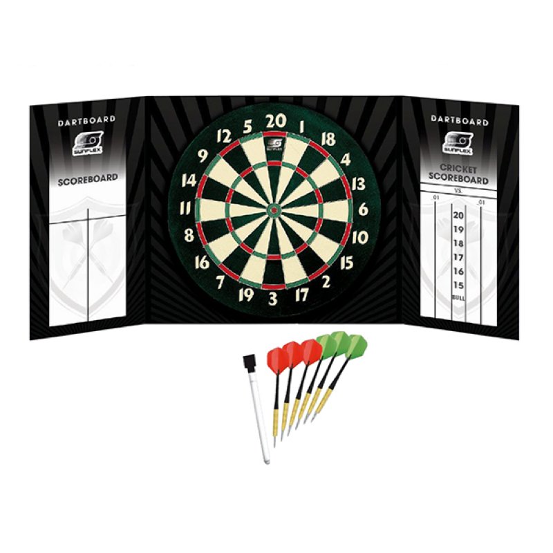Die Papierdartscheibe ALL IN ONE mit den 6 Messingdarts besticht nicht nur mit ihrer Turniergröße von 44.45 cm. Darts-Feeling für zu Hause. Sie wird auch in einem sportlichem Kartonkabinett verpackt, das gleichzeitig zum integrierten Schutz der Wand dient. So müssen Sie sich keine Gedanken um Löcher oder Dellen in der Wand mehr machen. Noch ein Vorteil: Mit dem abwaschbaren Markerstift können Sie am mitgelieferten Scoreboard für alle Standard Zählspiele aber auch Cricket an den Innenseiten der Türen den Spielstand notieren.