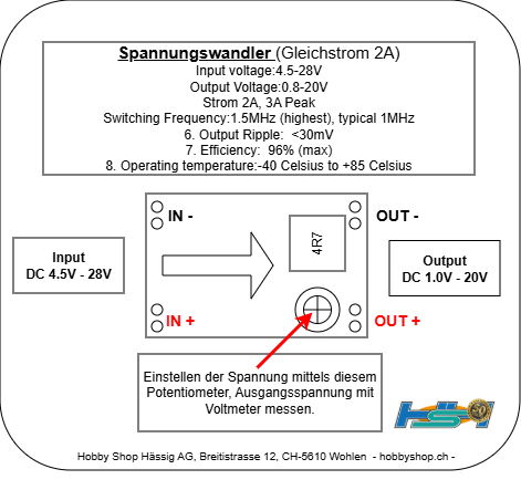 DC-DC Wandler, 2A, einstellbar. Zur Info, es kommt nie mehr Spannung raus, als in das Modul gegeben wird. Dieses Modul wird für das reduzieren der Spannung verwendet.