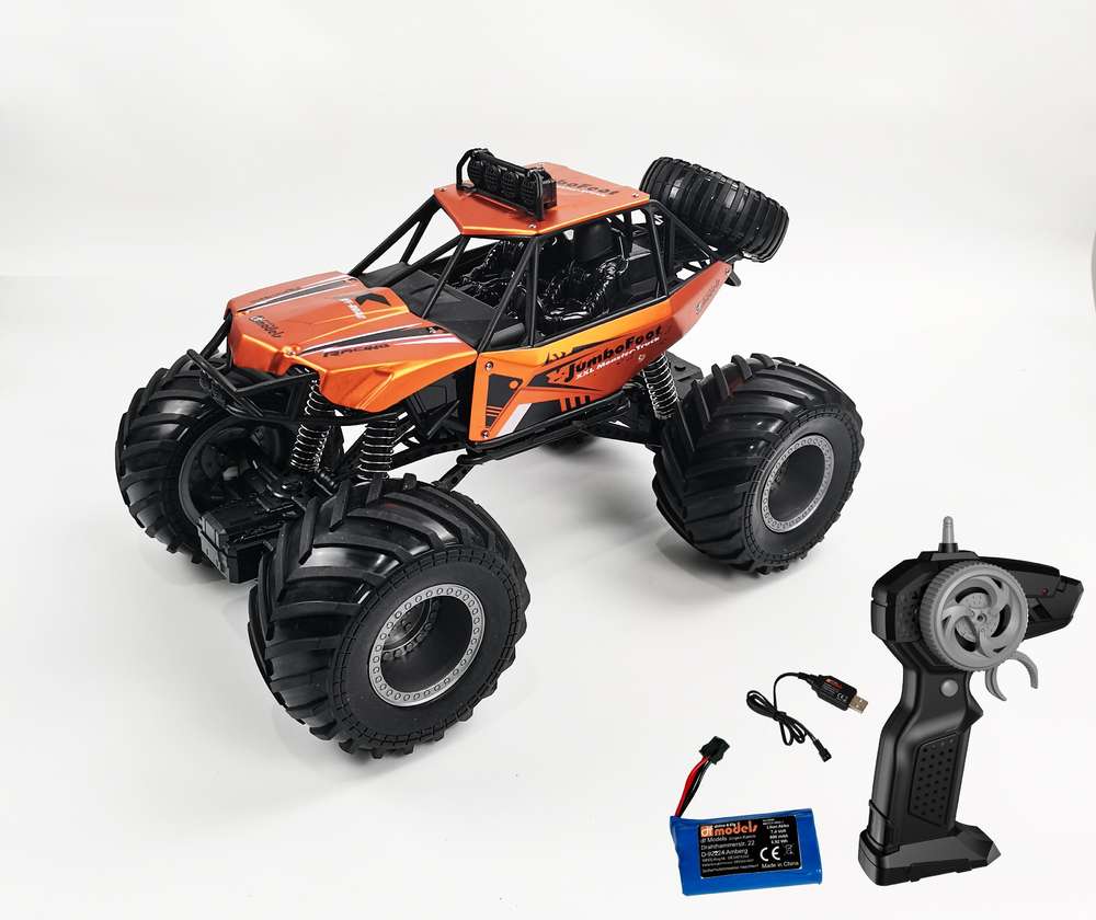 Der DF Models Jumbo Foot V2 Off-Roader 1:10 RTR ist ein imposanter XXL Monstertruck mit riesigen Luftreifen, der im Maßstab 1:10 gehalten ist. Mit seiner metallicfarben lackierten Metallkarosserie ist dieses Modell ein echter Blickfang! Dank des beiliegenden LiIon Akkus können Sie über 30 Minuten lang ununterbrochenen Fahrspaß genießen, abhängig von der Fahrweise und dem Gelände, auf dem Sie unterwegs sind. Die 2,4 GHz Fernsteuerung ermöglicht es, mehrere Modelle gleichzeitig parallel und ohne Störungen zu betreiben. Das eingebaute Soundmodul und die LED-Beleuchtung sorgen für zusätzliche Action und Spaß. Einfach auspacken, den Akku aufladen, Batterien (nicht im Lieferumfang) in den Sender einlegen und schon kann das Abenteuer mit dem RC-Car auf Parkplätzen und Wegen starten! Dieses Modell ist der ideale Einstieg in den RC Modellbau und eignet sich perfekt für Fahrer ab 6 Jahren. Gönnen Sie sich und Ihren Kindern mit dem DF Jumbo Foot V2 Truck ein unvergessliches RC-Erlebnis in XXL-Format!