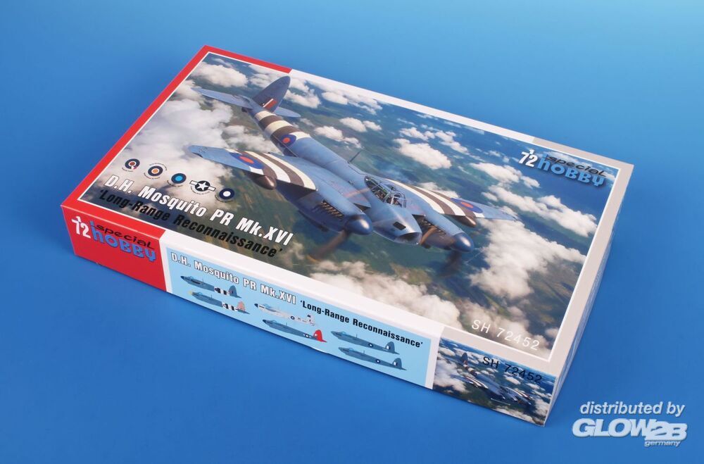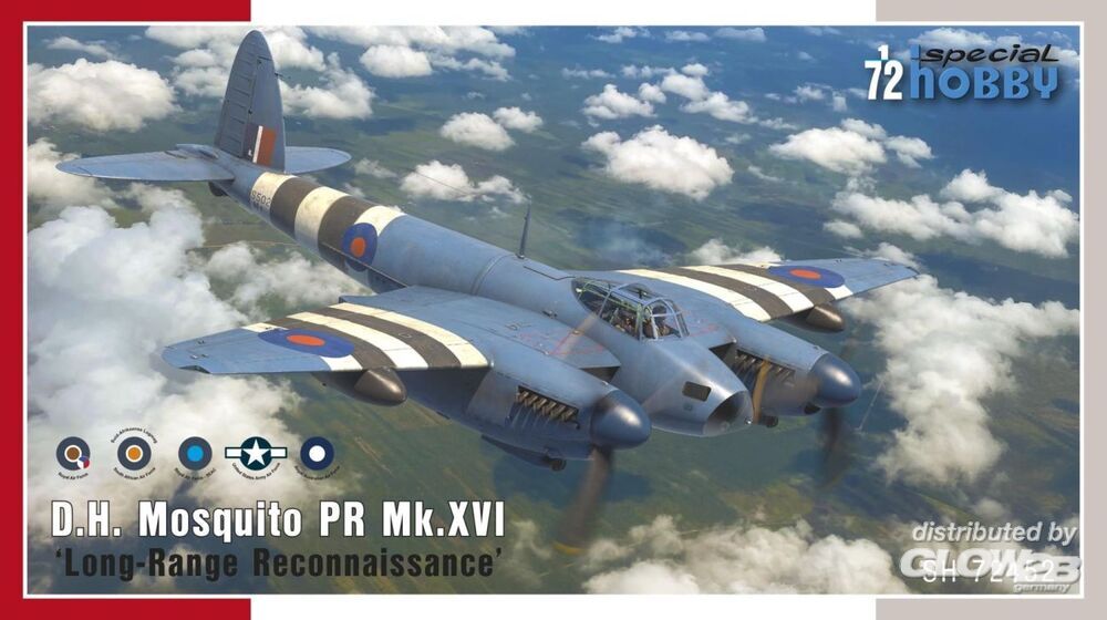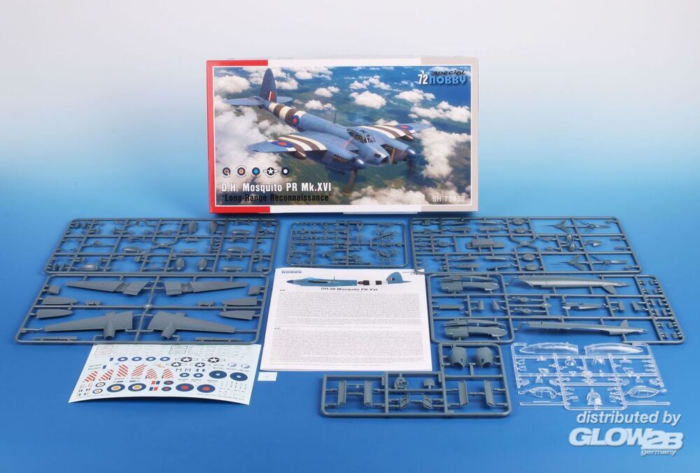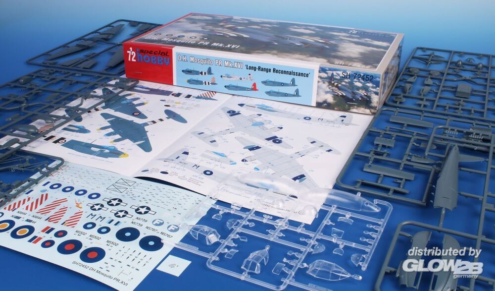 Die de Havilland Mosquito war ein vielseitiges zweimotoriges Flugzeug, das zu den besten Flugzeugen des Zweiten Weltkriegs gehörte. Nicht umsonst wurde sie als „Wooden Wonder“ (Holzwunder) bezeichnet. Sie wurde als Nachtjäger, Jagdbomber, Bomber, Aufklärungsflugzeug, Schiffsabwehrflugzeug oder Spezialtransportflugzeug eingesetzt. Die erste Generation der Mosquitos wurde von Merlin-Motoren mit einstufigen Kompressoren angetrieben. Im Frühjahr 1943 wurden zweistufige Merlin-Motoren mit höherer Leistung in größeren Höhen in die Mosquito eingebaut. Daraus entstanden die Aufklärungsversion PR Mk.IX und der Bomber B Mk.IX. Sie wurden nur in begrenzter Stückzahl produziert, da sie in der Produktion durch die serienmäßig hergestellten Versionen PR Mk.XVI und B Mk.XVI ersetzt wurden, die mit einem Druckcockpit ausgestattet waren. Die Leistung der PR Mk.XVI-Version war so hoch, dass feindliche Jäger sie kaum bedrohen konnten. Die PR Mk.XVI-Aufklärungs-Mosquitos operierten von den Britischen Inseln und Italien aus über ganz Europa. Aber nicht nur über Europa, britische Mosquitos wurden auch gegen Japan eingesetzt und flogen von Indien aus. Die RAAF setzte die Mosquito PR Mk.XVIs ein, um Aufklärungsmissionen von Stützpunkten in Nordaustralien aus zu fliegen.Der neue, hochdetaillierte Bausatz enthält fünf Spritzgussrahmen mit grauen Kunststoffteilen und einen mit transparenten Teilen. Die Abziehbilder zeigen eine RAF-Maschine mit Invasionsstreifen, die auch von tschechoslowakischen Piloten eingesetzt wurde, eine SAAF-Maschine, die von Italien aus operierte und ein Heck mit roten und weißen Streifen hatte, eine USAAF-Maschine aus Großbritannien mit rotem Heck und Nasenbemalung auf dem Rumpf, eine RAF-Maschine, die in Indien mit SEAC-Kennzeichen flog, sowie zwei RAAF-Maschinen. Eine davon führte den letzten Kampfeinsatz der RAAF im Zweiten Weltkrieg durch.- hochdetaillierter Bausatz- interessante Version- ansprechende Markierungen und Decals