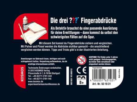 Inhalt: Fingerabdruck-Pulver, Pinsel, transparente Klebefolien, Fingerabdruck-Block und eine farbig illustrierte Anleitung