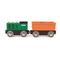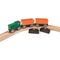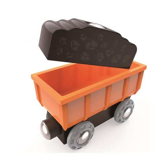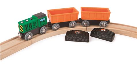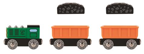 1. Schiebe den Zug über das Gleis. 2. Entlade mit einem Hape-Kran das Erz von den Güterwagen.