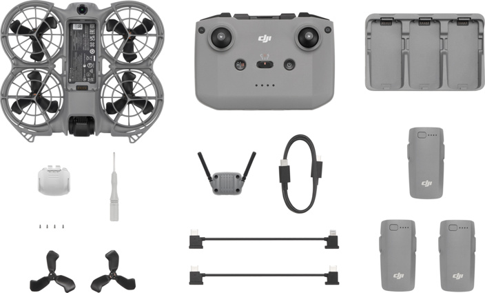1 x DJI RC-N3 Remote Controller 1 x DJI RC-N Series RC Cable (USB-C Connector) 1 x DJI RC-N Series RC Cable (Lightning Connector) 3 x DJI Neo 2 Intelligent Flight Battery 1 x DJI Neo 2 Two-Way Charging Hub 1 x DJI Neo 2 Spare Propellers (Pair) 4 x DJI Neo 2 Spare Propeller Screw 1 x Screwdriver 1 x DJI Neo 2 Propeller Guard (Pair) 1 x DJI Neo 2 Digital Transceiver 1 x DJI Neo 2 Gimbal Protector 1 x USB-C to USB-C Data Cable 1 x Documents (Quick Start Guide, Safety Guidelines and DJI Logo Stickers) |