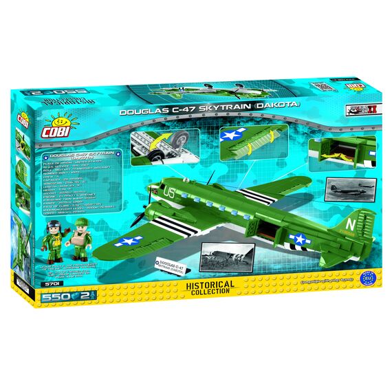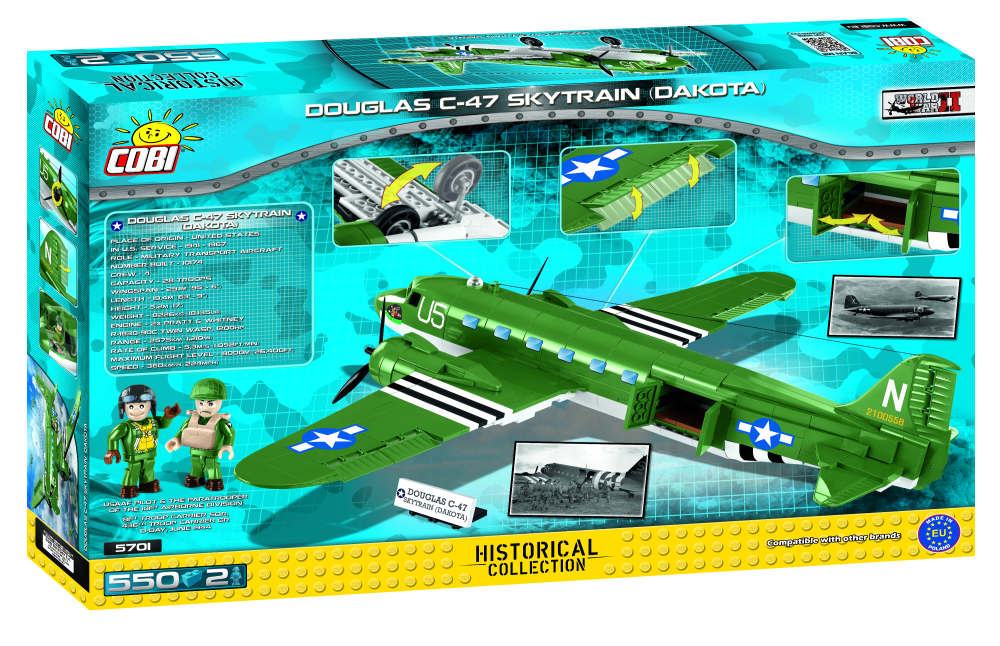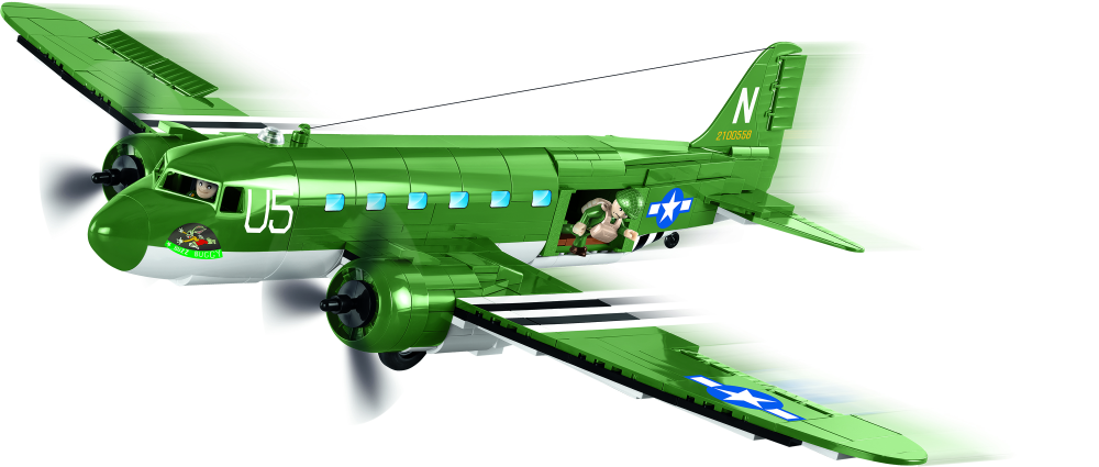 Die DC-47 Skytrain der Douglas Air Company (RAF: Douglas Dakota) ist die militärische Variante der DC-3 und wurde von den Allierten im 2. Weltkrieg als Transporter, Schlepper und Sanitätsflugzeug eingesetzt. Am D-Day waren geschätzte 850 Maschinen beteiligt. Modell mit Piloten- und Fallschirmjägerfigur, beweglichen Propellern, einem zusammenklappbaren Fahrwerk, beweglichen Quer- und Höhenrudern und mit öffenbarer Ausstiegsluke. 550 Teile, 2 Figuren, Bausteine mit Aufklebern, Aufkleberbogen, leicht verständliche Anleitung. Modellmasse (LxBxH): 44.5 x 56 x 12 cm