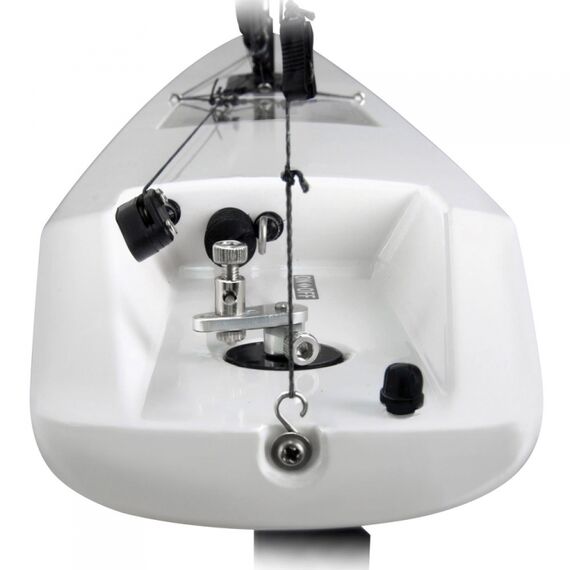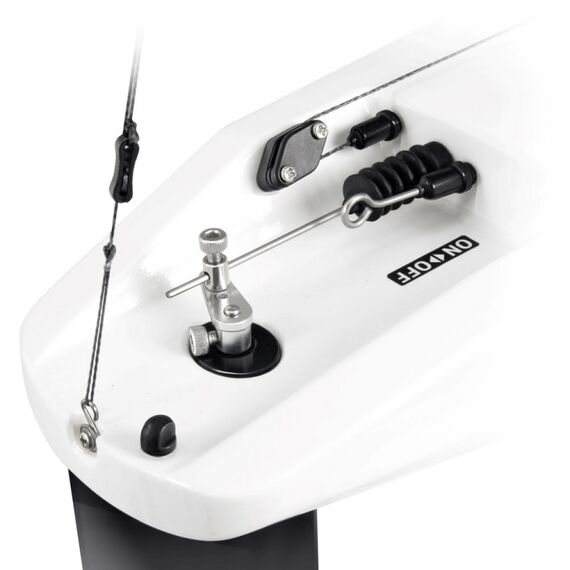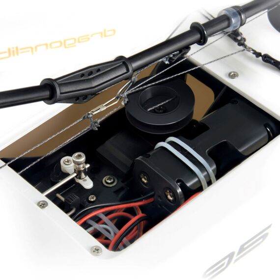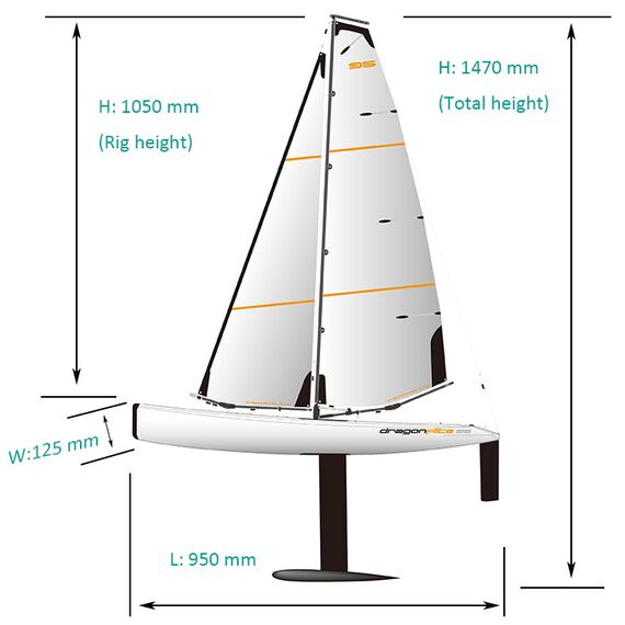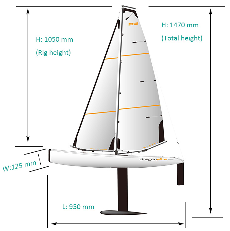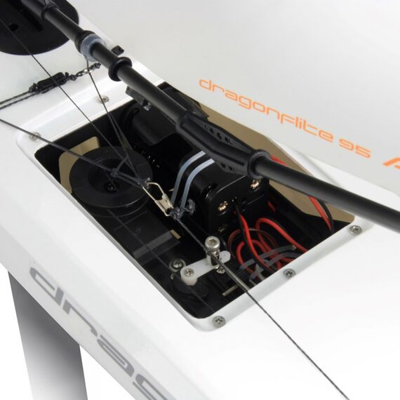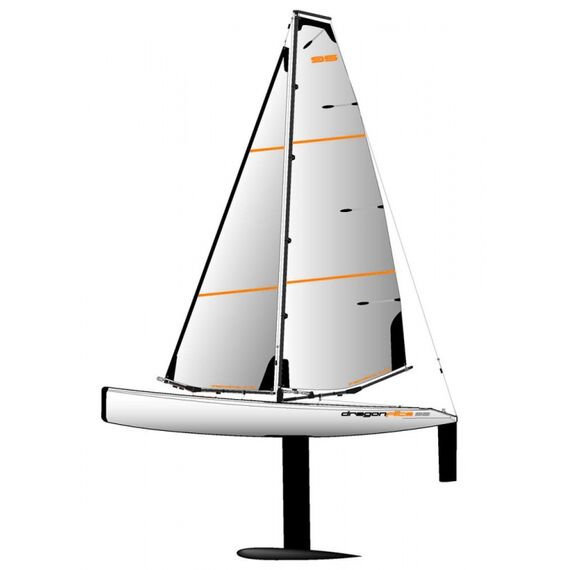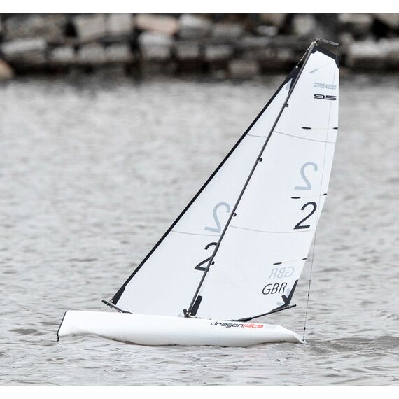 The new Dragonflite 95 is the next logical step in providing a high performance, competition yacht at a fraction of the price of normal models in the 1 metre class. This yacht is unique in concept from nearly every aspect. The sleek and unusually narrow hull is designed to cut through the water with minimum drag. The fin is moulded from ultra-rigid carbon fibre to provide the correct balance of low drag and high strength. Above deck, the entire sail rig has been optimised through careful testing for both area & shape and the sails are made from durable Mylar with all necessary re-inforcements. The unusual 'kick' in the main boom is designed to prevent it dragging in the water at extreme lean angles. Inside is a special sail winch and a high power, metal-geared servo for steering. Join the new yacht racing revolution with the Dragonflite 95!