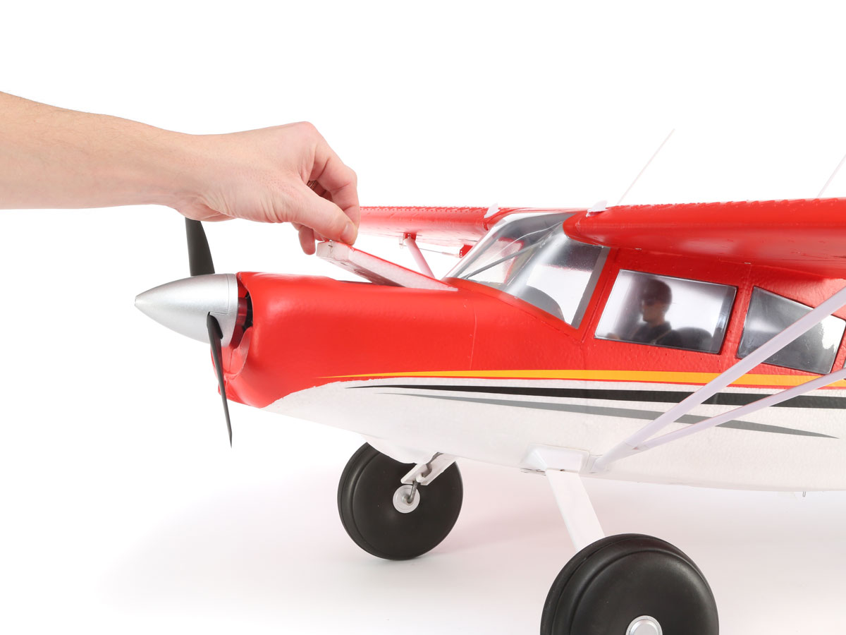 Für die Montage wird kein Klebstoff benötigt. Die zweiteilige Tragfläche mit den klappbaren Streben sorgt für einfachen Transport und Lagerung. Das Höhenleitwerk wird einfach in Halterung geschoben und schnell und einfach mit Schrauben gesichert.