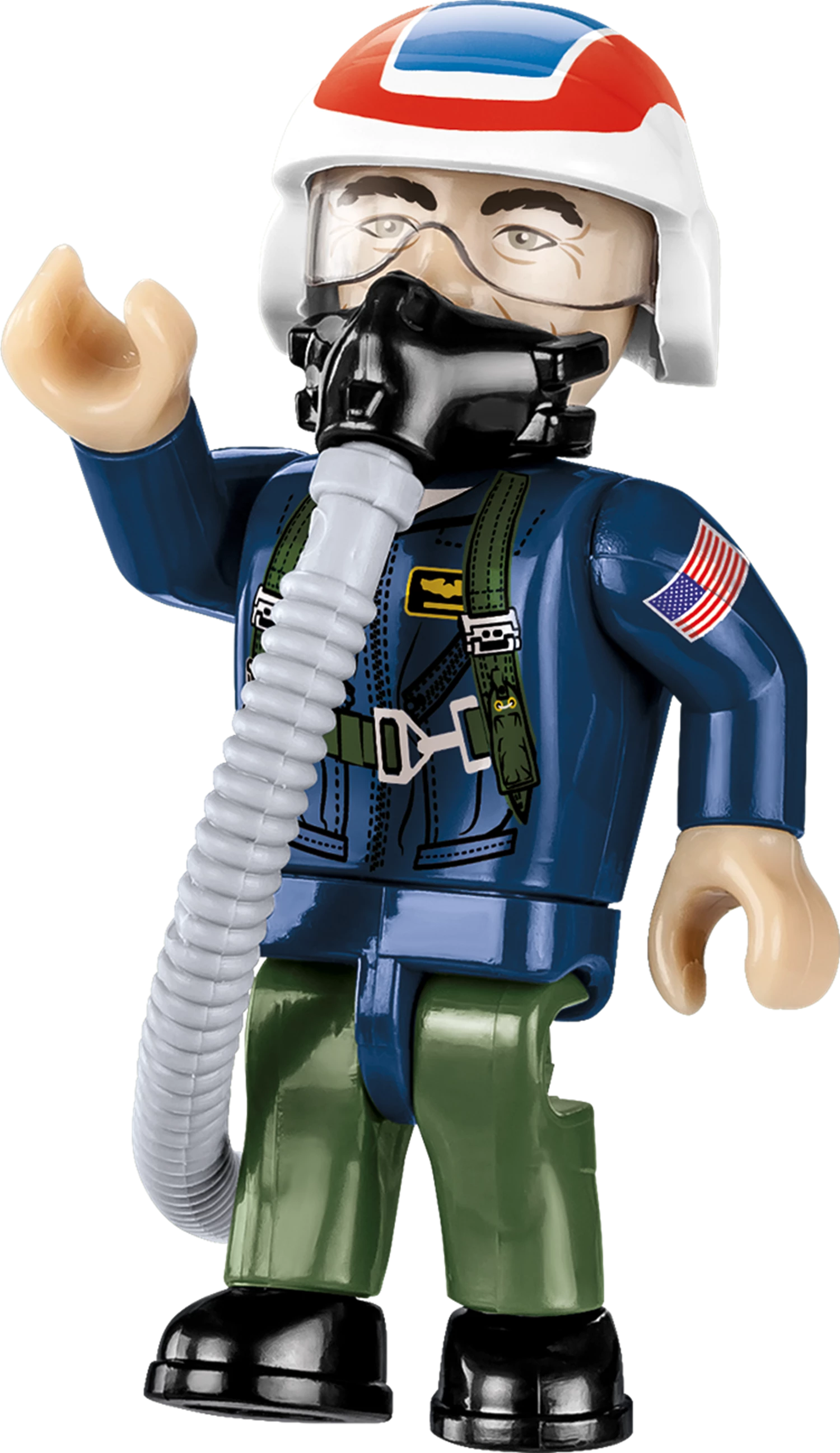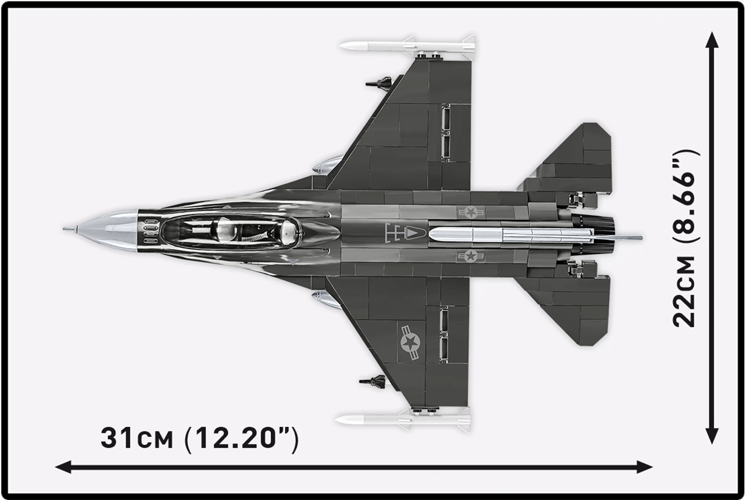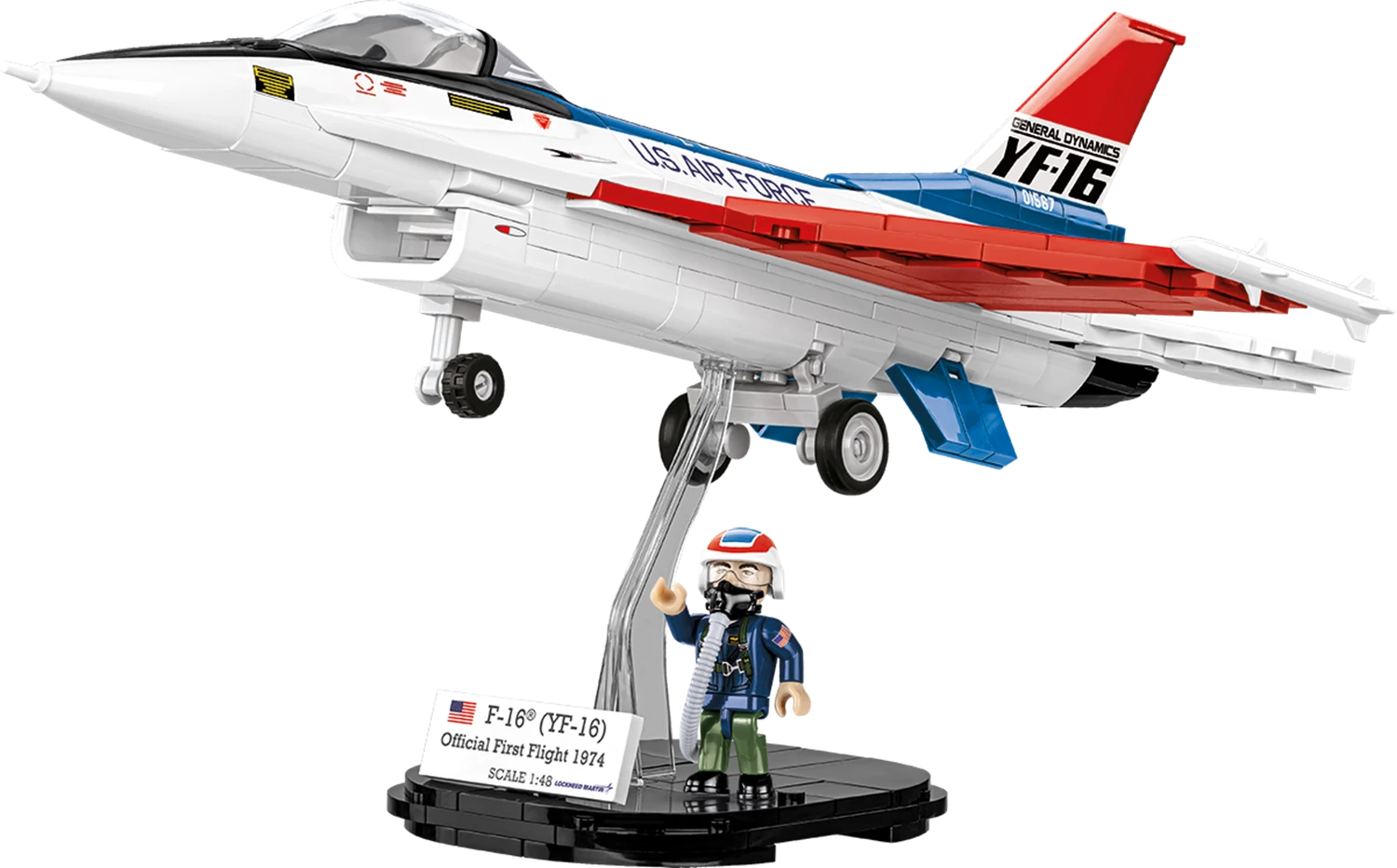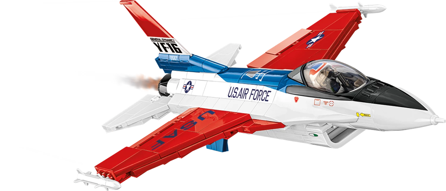 Die F-16 Fighting Falcon ist ein einstrahliges Mehrzweckkampfflugzeug des US-amerikanischen Herstellers Lockheed Martin. Im Zuge des Lightweight-Fighter-Programms, einem 1974 ausgetragenen Konstruktionswettbewerb für ein kostengünstiges Flugzeug mit einem Schub-Gewicht-Verhältnis von grösser 1, was den senkrechten Steigflug ermöglicht, wurden zwei US-amerikanische Flugzeughersteller aufgefordert, einen Prototypen zu entwerfen: General Dynamics die YF-16 und Northrop die zweistrahlige YF-17 Cobra. Die YF-16 hatte ihren Erstflug am 2. Februar 1974 und wurde von der US Air Force für die Serienproduktion ausgewählt. Die F-16 Fighting Falcon wurde zuerst in einer einsitzigen (F-16A) und einer zweisitzigen Trainingsversion (F-16B) produziert. Die F-16D ist die Zweisitzervariante der F-16C, welche auf der F-16A basiert, aber mit stark verbesserter Avionik und grösserer Waffenkapazität ausgerüstet ist. Diese Version wurde im September 1984 in Dienst gestellt und ihrerseits immer wieder überarbeitet. Modell mit 436 Teilen, 2 Figuren, bedruckten Blöcken und beweglichen Elementen. Modellmasse (LxBxH): 31 x 22 x 11.5 cm.