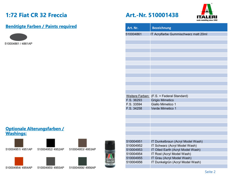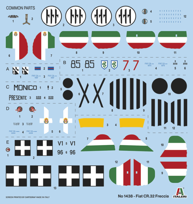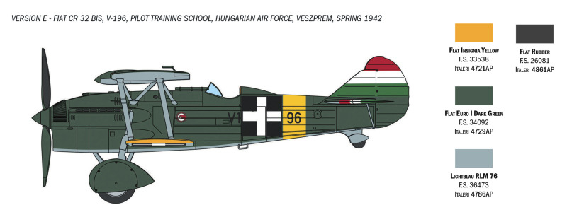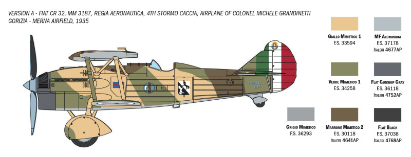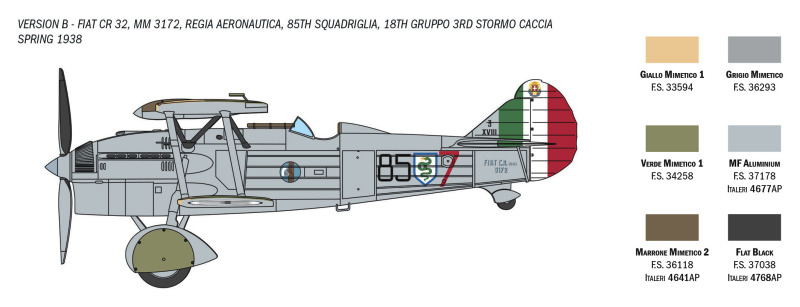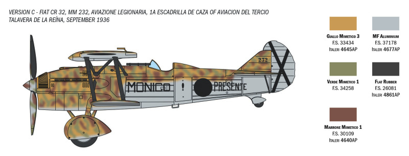 Der Fiat CR 32 wurde in der ersten Hälfte der 30er Jahre von dem berühmten Ingenieur Rosatelli entwickelt. Angetrieben von einem 12-Zylinder V-Motor von 600 PS konnte diese Maschine 375 Km/h erreichen. Der Fiat CR 32 gehört zu den bekanntesten Doppeldeckern der Geschichte der Luftfahrt und zeichnete sich durch eine außerordentliche Wendigkeit aus. Diese Maschine war auch robust und für die damalige Zeit gut bewaffnet: sie verfügte über zwei Maschinengewehre 12,7 mm Breda-Safat, die durch die Propellerscheibe schossen. Der Fiat CR 32 hatte seine Feuertaufe mit der Legionärs-Luftwaffe, während des Spanischen Bürgerkriegs und dominierte bald über die sowjetischen Jagdflugzeuge wie die Polikarpov I-16, mit denen die Abteilungen der republikanischen Luftwaffe ausgestattet waren. Dank der außergewöhnlichen Wendigkeit und der Ausbildung der italienischen Piloten dominierte der CR 32 auch über modernere und zeitgenössischere Flugzeuge. Auch das schnelle sowjetische Bombenflugzeug Tupolev SB-2, das eben wegen seiner Schnelligkeit als nicht abfangbar galt, erlitt zahlreiche Verluste während der Luftkämpfe mit den "Chirri" der Legionärs-Luftwaffe.