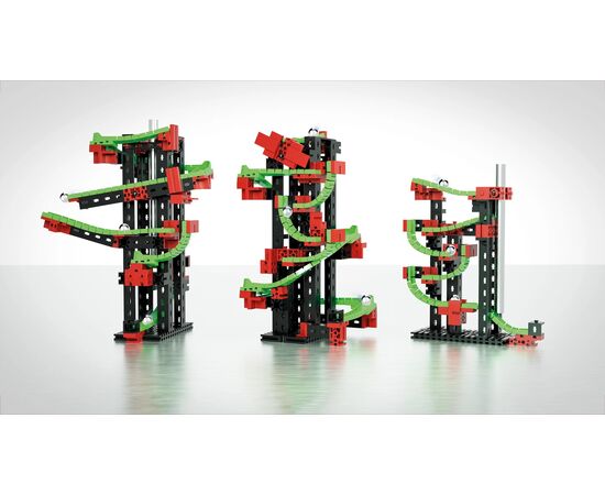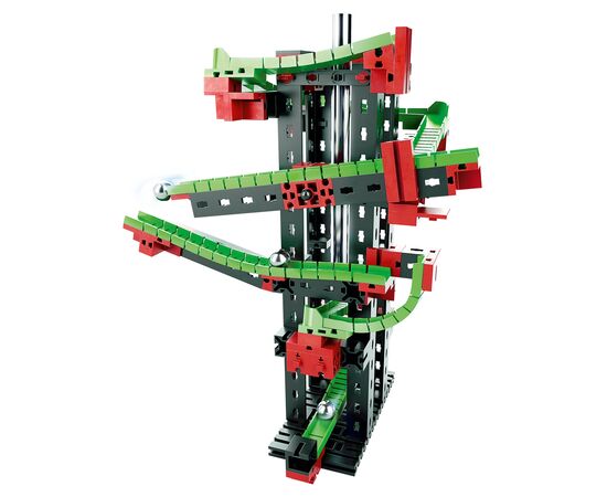 "Kugelparcours und fischertechnik – zwei Klassiker garantieren Spielspaß! Die Kugel startet in den Parcours, beschleunigt und erreicht die Wechselweiche und stürzt dann weiter die Bahn hinab – ab geht´s in zwei unterschiedliche Bahnkreisläufe - einmal links, einmal rechts! Beim Titelmodell flitzt die Kugel durch mehrere 90°-Kurven, über eine Wippe und streift dann das Klangrohr – ""BING""! Die Kugeln werden am Ende der Bahn gesammelt und können bequem wieder entnommen werden. Mit über 140 Bauteilen entstehen drei eindrucksvolle Parcours nach Bauanleitung. Darüber hinaus können junge Ingenieure nahezu unendlich viele weitere Parcours nach eigenen Ideen konstruieren. Drei Modelle: Einfacher Parcours, Action-Parcours und Parcours mit zwei Bahnkreisläufen! Tauche ein in die faszinierende, kreative Welt der fischertechnik Kugelparcours und erlebe Action pur! Inkl.: Klangrohr, 4x 90°-Kurve, 3x Kugel, 6x Flexschiene 90, 3x Flexschiene 180. Ideale Ergänzungen: Alle Baukästen der Dynamic-Linie, Sound+Lights, LED Set "